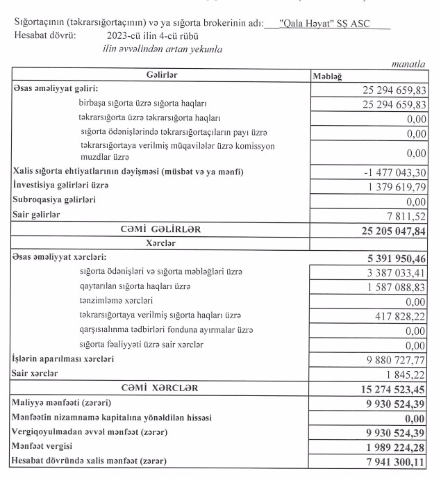 "Qala Həyat Sığorta Şirkəti" ASC 2024-cü ili 8 milyon 318 min manat xalis mənfəət ilə başa vurub. Halbuki, Şirkət 2023-cü ili 7 milyon 941 min manat xalis mənfəət ilə bağlamışdı. Beləliklə,"Qala Həyat Sığorta Şirkəti"nin xalis mənfəəti 2024-cü ildə 2023-cü illə müqayisədə 377 min manat və ya 4,7% artıb.