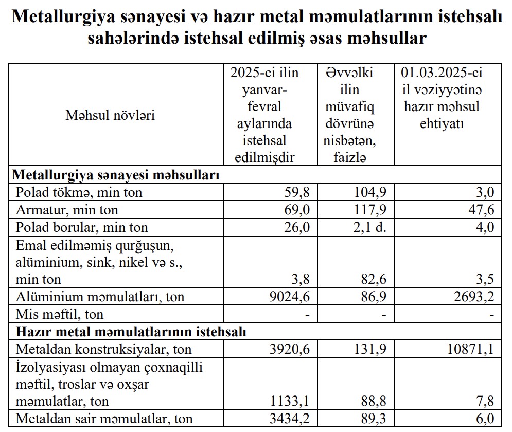 Metallurgiya sənayesi və hazır metal məmulatlarının istehsalı sahələrində 2025-сi ilin yanvar-fevral aylarında 190,9 milyon manatlıq məhsul istehsal olunmuş, əvvəlki ilin müvafiq dövrü ilə müqayisədə metallurgiya sənayesi məhsullarının istehsalında 5,9 faiz, hazır metal məmulatlarının istehsalı sahəsində isə 9 faiz azalma müşahidə olunmuşdur. 2025-сi ilin yanvar-fevral aylarında metallurgiya sənayesi üzrə alüminium məmulatlarının istehsalı 13,1 faiz, hazır metal məmulatlarının istehsalı sahəsi üzrə izolyasiyası olmayan çoxnaqilli məftil, troslar və oxşar məmulatların istehsalı isə 11,2 faiz azalmışdır.
