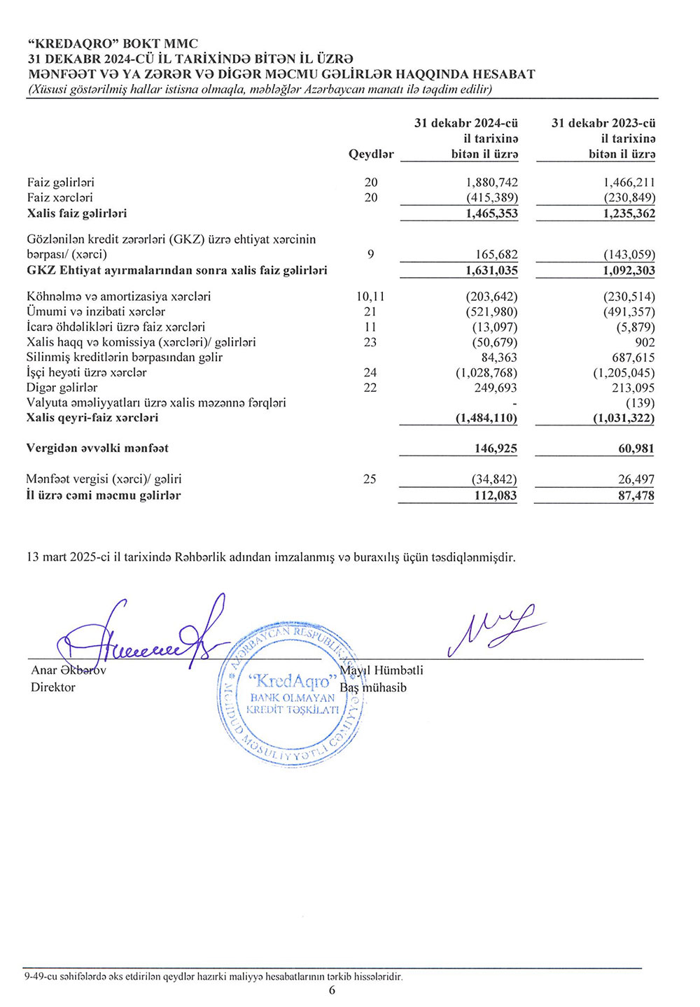 Təşkilatın 2024 cü il üzrə ümumi faiz gəlirləri 1 milyon 880 min 742 manat olmuşdur ki, bu da əvvəlki ilin sonu ilə müqayisədə 28.27 % artmışdır. Digər müsbət göstərici olaraq, təşkilatın xalis kredit portfeli ötən il ilə müqayisədə 1 milyon 576 min 374 manat, yəni 29.53 % nisbətində artım olmuş və problemli kreditlərin səviyyəsi ötən illə müqayisədə 1,38% nisbətində azalmışdır.
