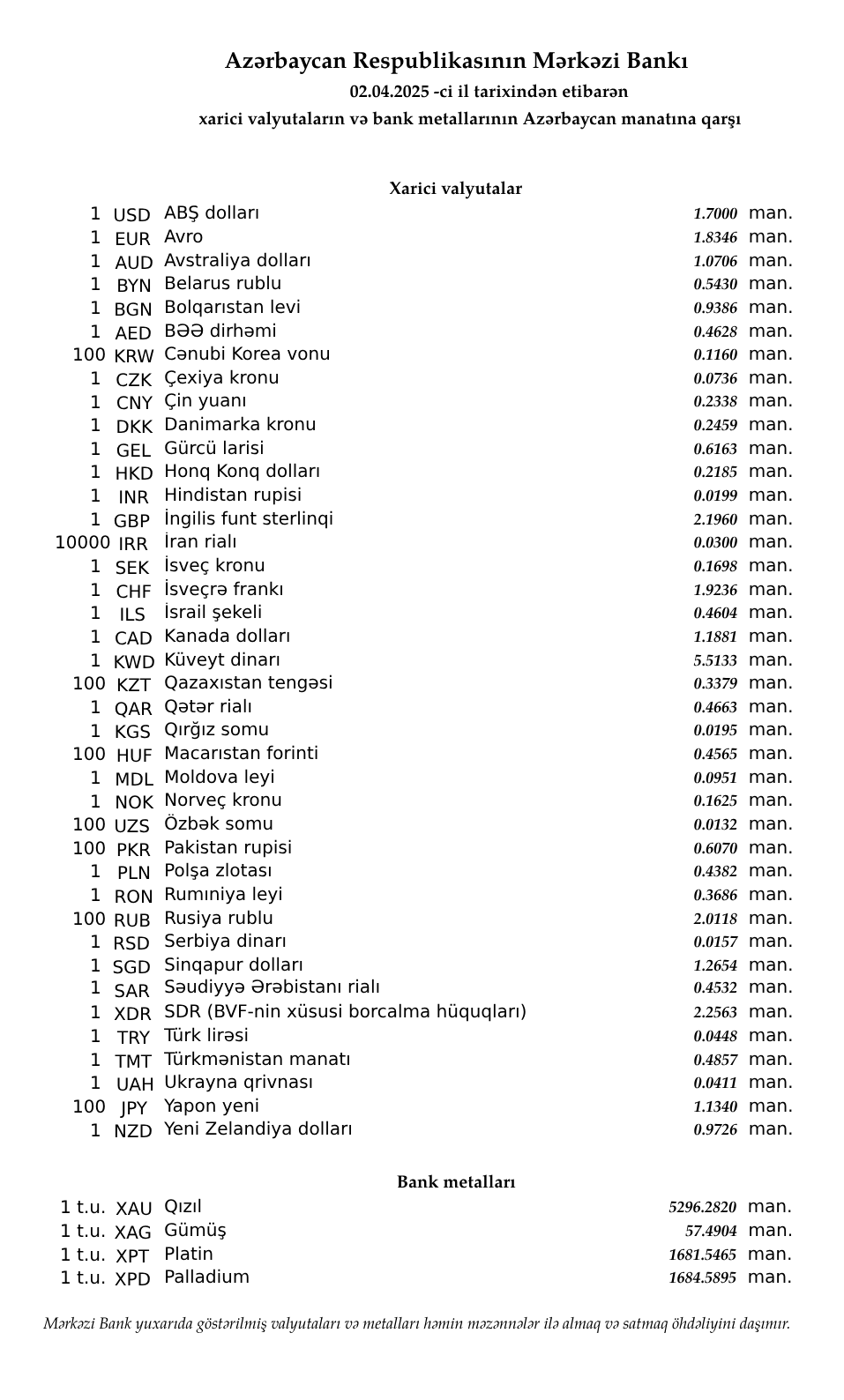 Rəsmi məzənnələr açıqlandı