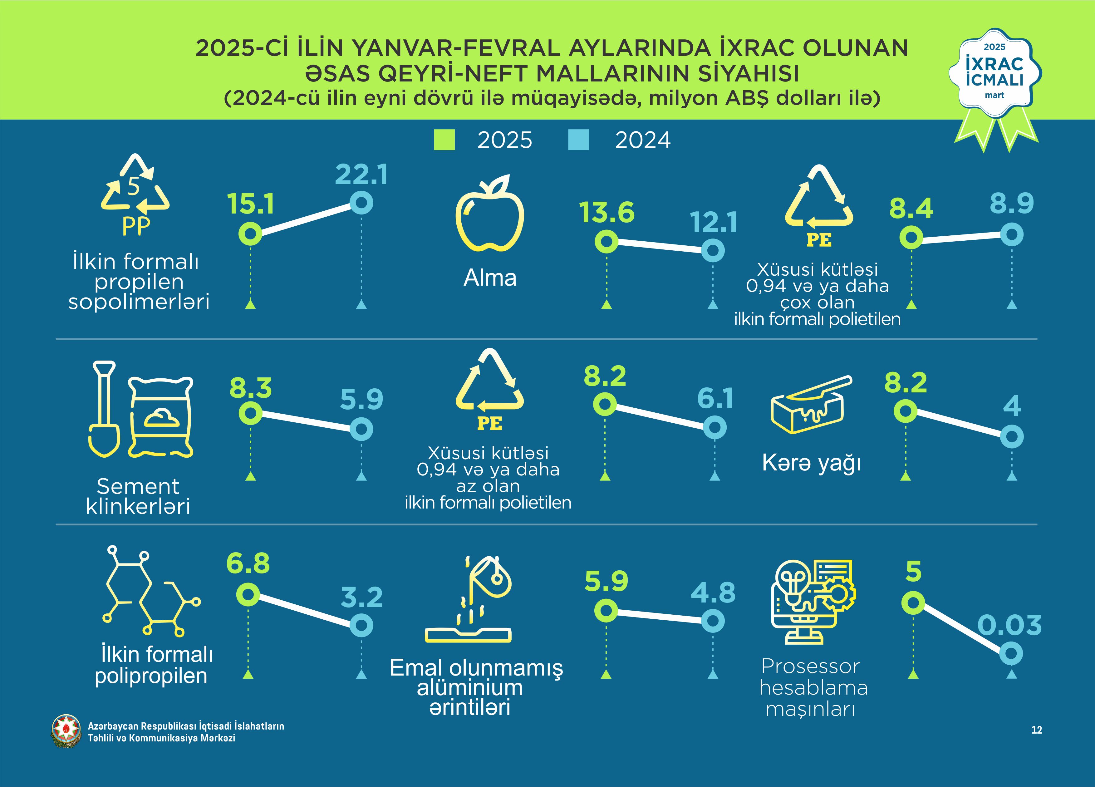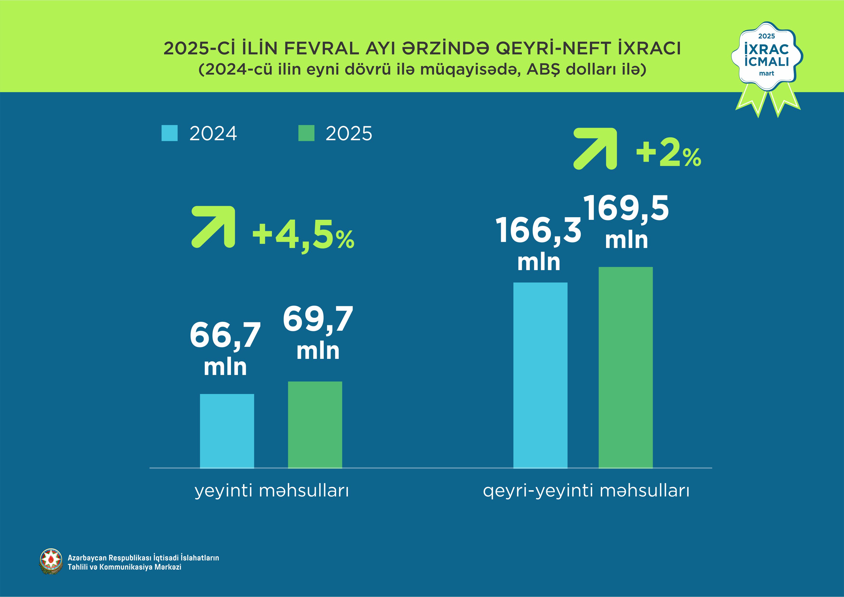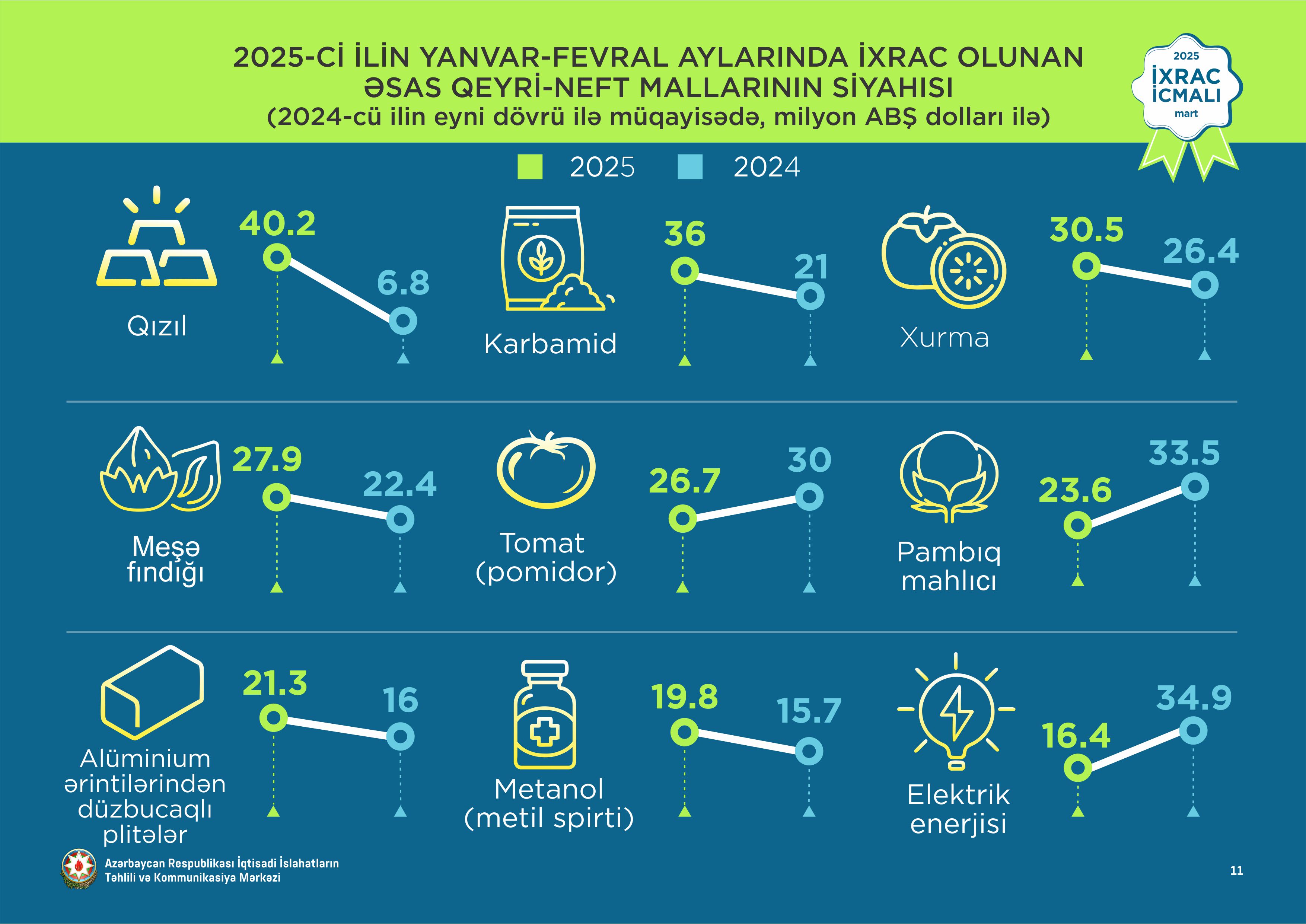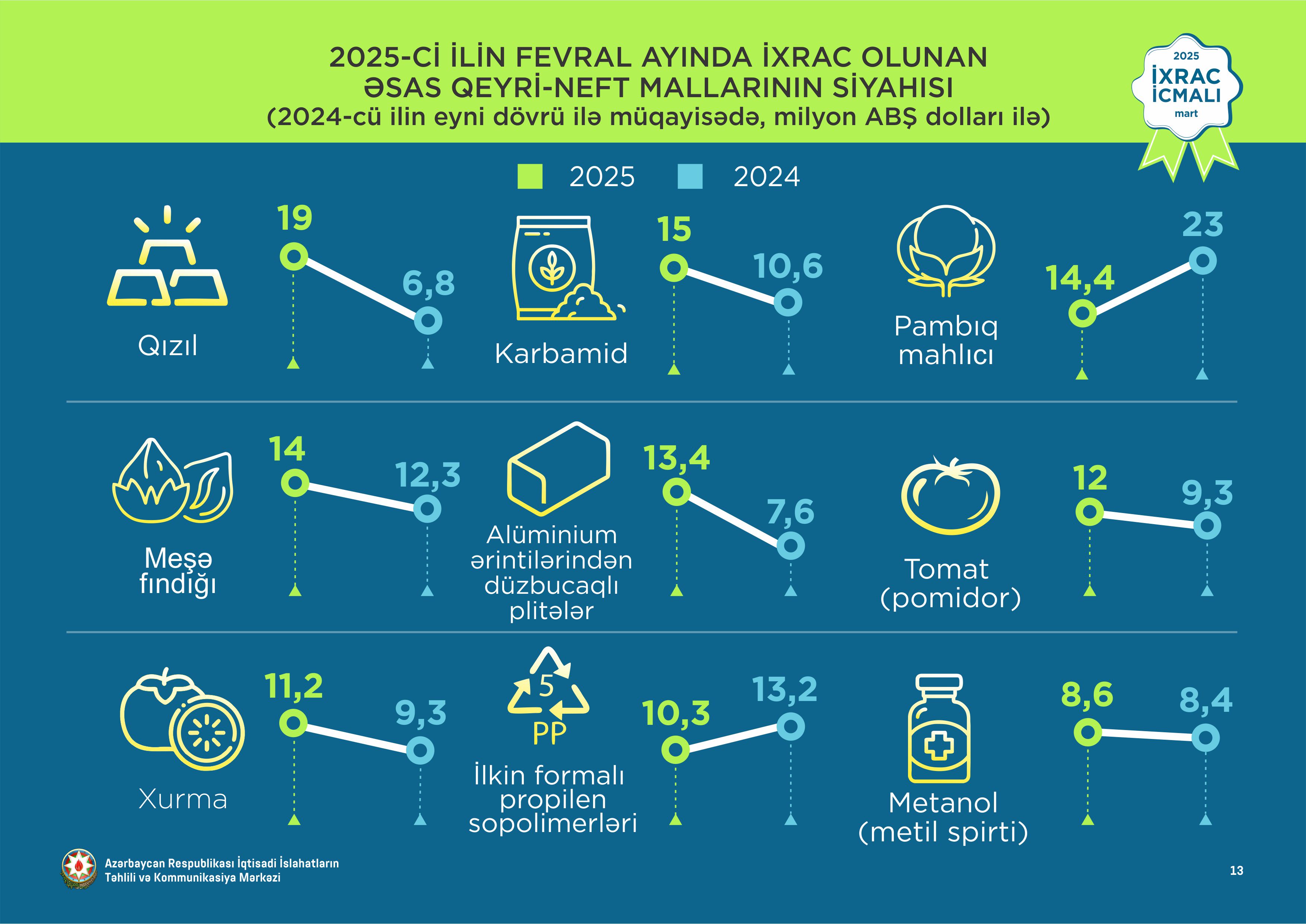 2025-ci ilin fevral ayı ərzində ixrac edilmiş qeyri-neft sektoruna aid malların siyahısında qızıl (19 milyon ABŞ dolları) birinci olub. Bu siyahıda karbamid (15 milyon ABŞ dolları) ikinci, pambıq (14,4 milyon ABŞ dolları) isə üçüncü yerdə qərarlaşıb.