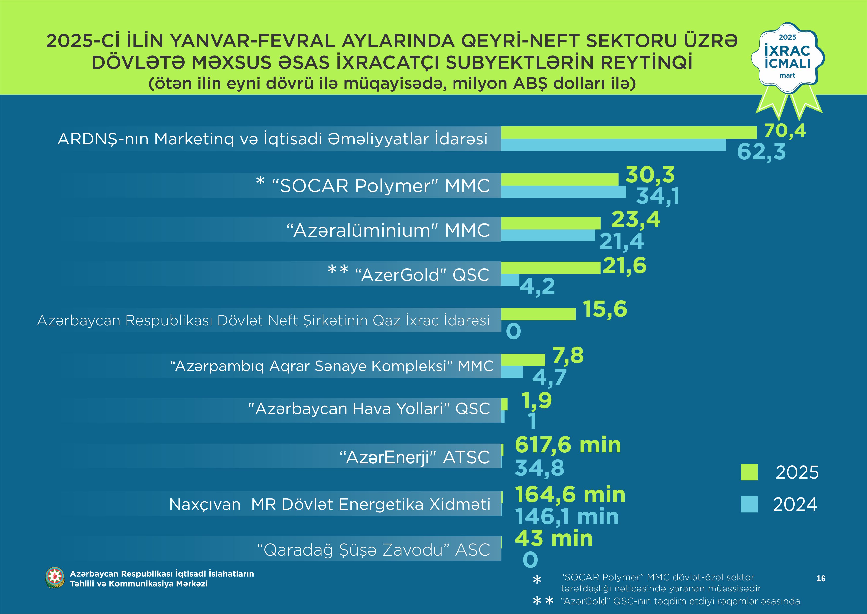 2025-ci ilin yanvar-fevral ayları üzrə hazırlanmış qeyri-dövlət ixracatçı subyektlərin reytinqində ilk onluqda aşağıdakı şirkətlər təmsil olunublar: "Azərbaycan İnterneyşnl Mayninq Kompani Limited Şirkəti"nin Azərbaycan Respublikasındakı Nümayəndəliyi, "MKT İstehsalat Kommersiya" MMC, "LEPIN LM" Məhdud Məsuliyyətli Cəmiyyəti, "Baku Steel Company" QSC, "Export Stream" Məhdud Məsuliyyətli Cəmiyyəti, "Avrora" Məhdud Məsuliyyətli Cəmiyyəti, "Sahdag Sy" Məhdud Məsuliyyətli Cəmiyyəti, "6LSYSTEMS" MMC,"Agrarco" MMC, "KHAN-EL" MMC.
