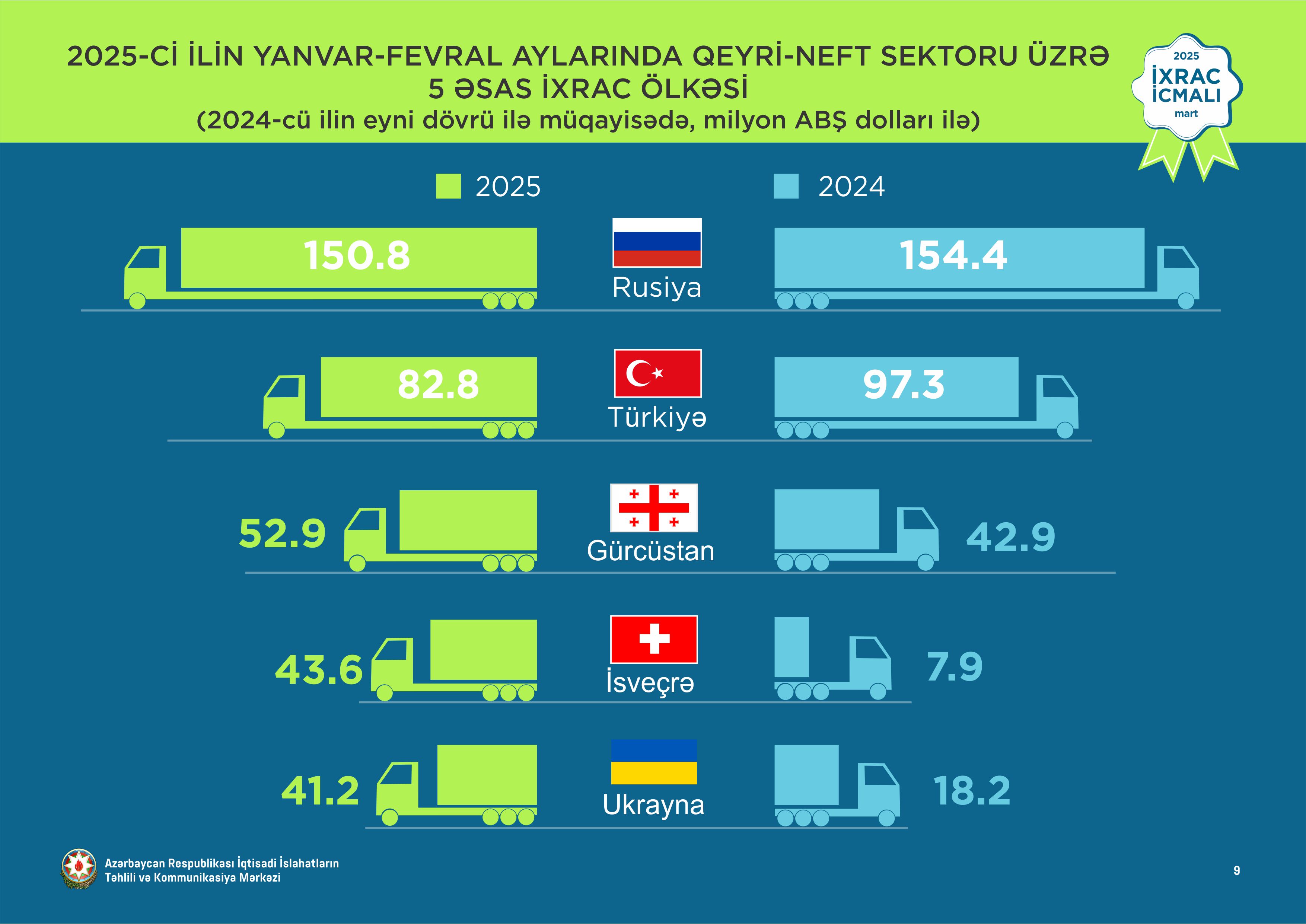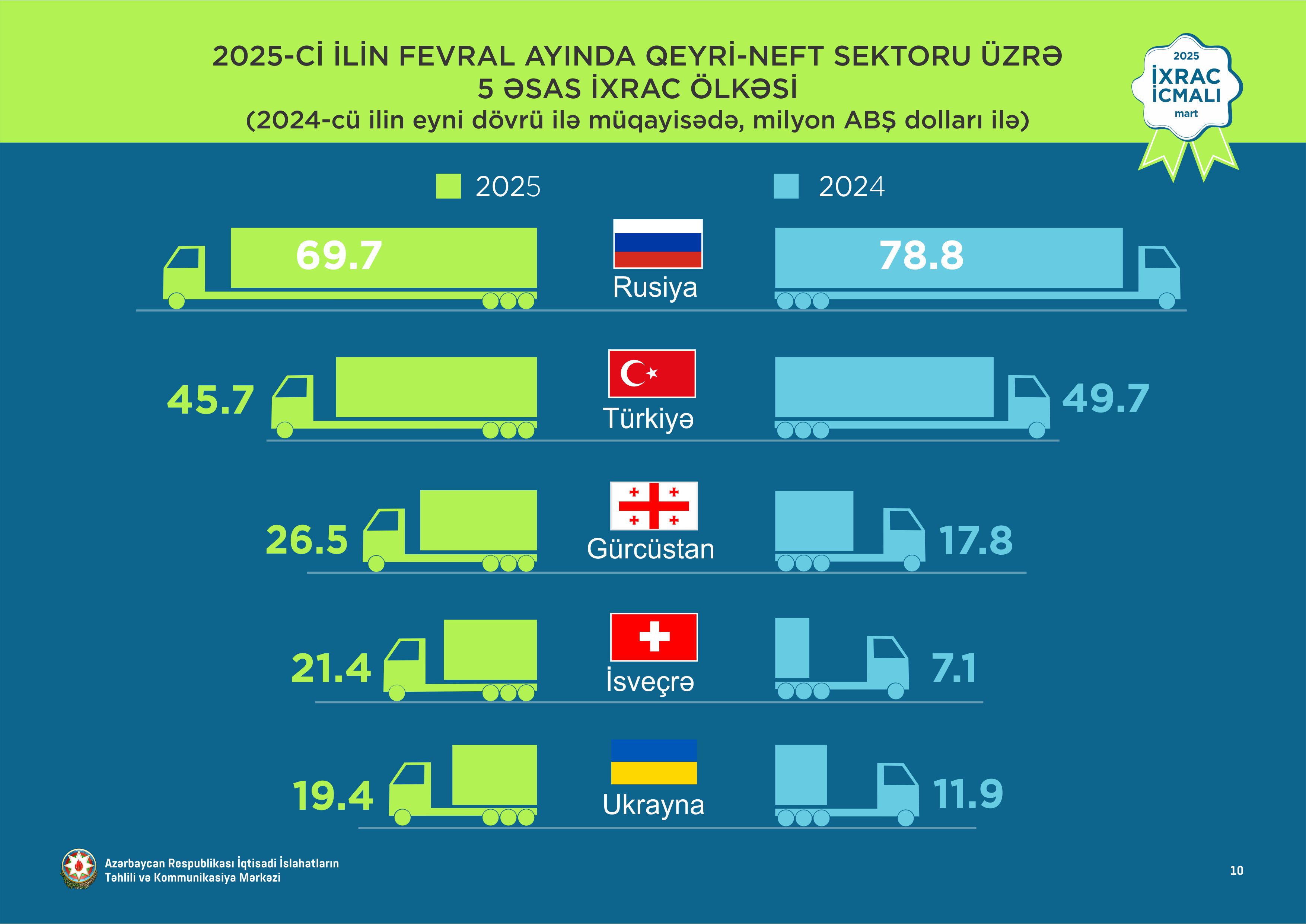 2025-ci ilin fevral ayında Rusiya Federasiyasına 69,7 milyon ABŞ dolları, Türkiyəyə 45,7 milyon ABŞ dolları, Gürcüstana 26,5 milyon ABŞ dolları, İsveçrəyə 21,4 milyon ABŞ dolları, Ukraynaya isə 19,4 milyon ABŞ dolları dəyərində qeyri-neft sektoruna aid mal ixrac edilib.