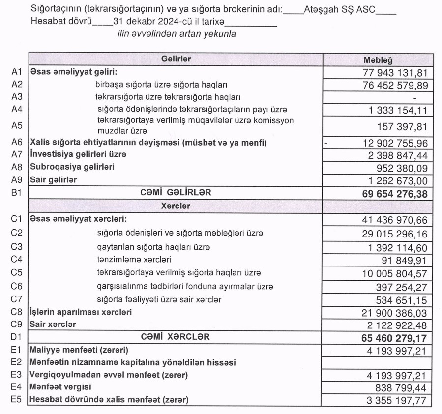 "Atəşgah Sığorta Şirkəti" ASC 2024-cü ili 3 milyon 355 min manat xalis mənfəət ilə başa vurub. Şirkət 2023-cü ili 437 min manat xalis mənfəət ilə bağlamışdı. Beləliklə, "Atəşgah Sığorta Şirkəti"nin xalis mənfəəti 2024-cü ildə 2023-cü illə müqayisədə 7,7 dəfə artıb.