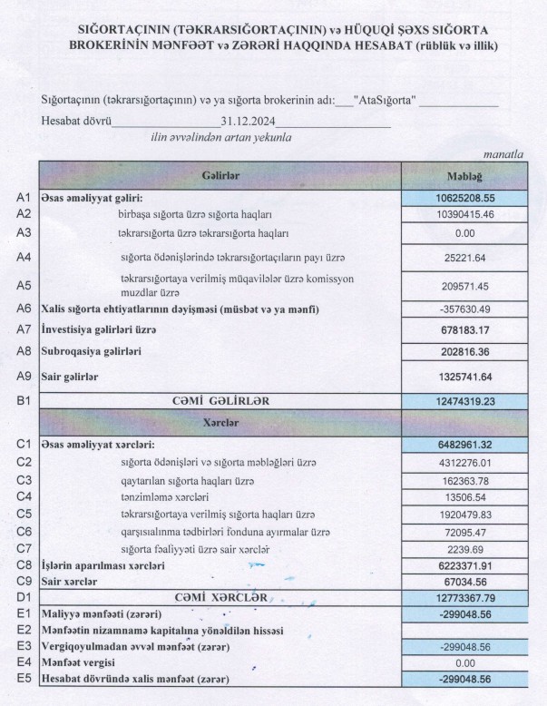 "AtaSığorta" ASC 2024-cü ili 299 min manat xalis zərər ilə başa vurub. Şirkət 2023-cü ili 947 min manat xalis zərər ilə bağlamışdı. Beləliklə, "AtaSığorta"nın xalis zərəri 2024-cü ildə 2023-cü illə müqayisədə 648 min manat və ya 3,2 dəfə azalıb.