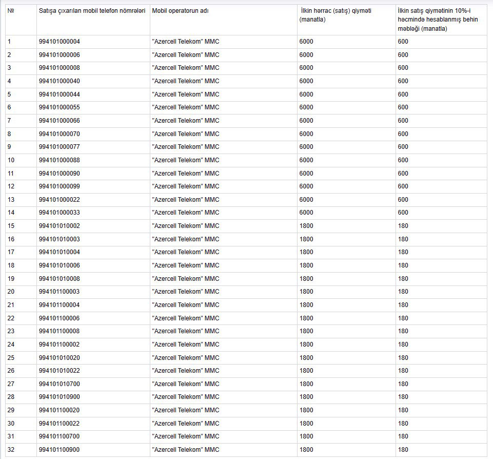 11 aprel 2025-ci il tarixində saat 10:00-da hərraca çıxarılacaq "Azercell Telekom" MMC-yə məxsus mobil telefon nömrələri haqqında elan