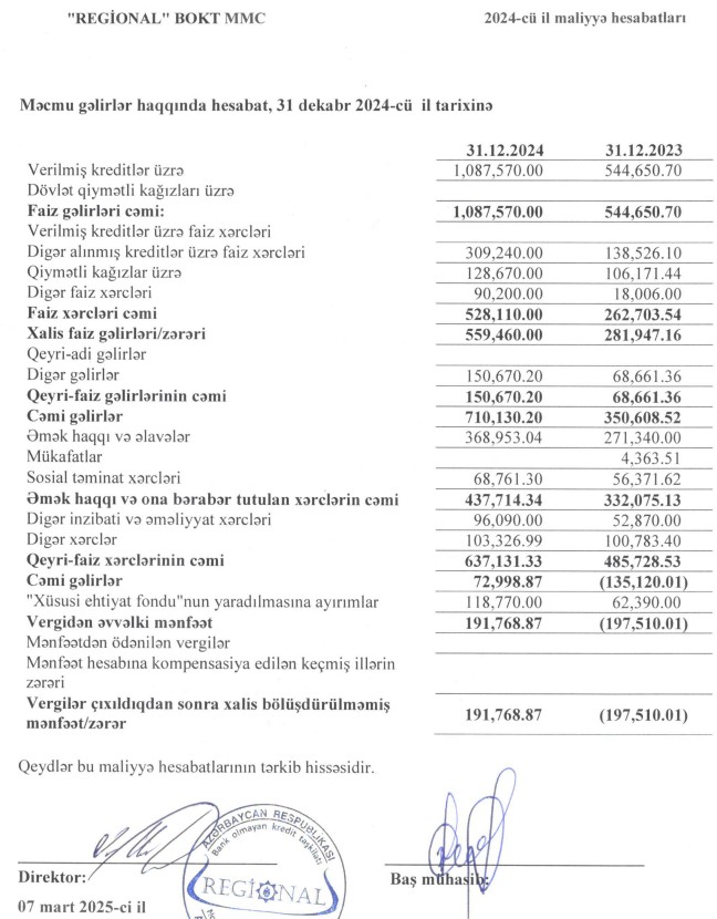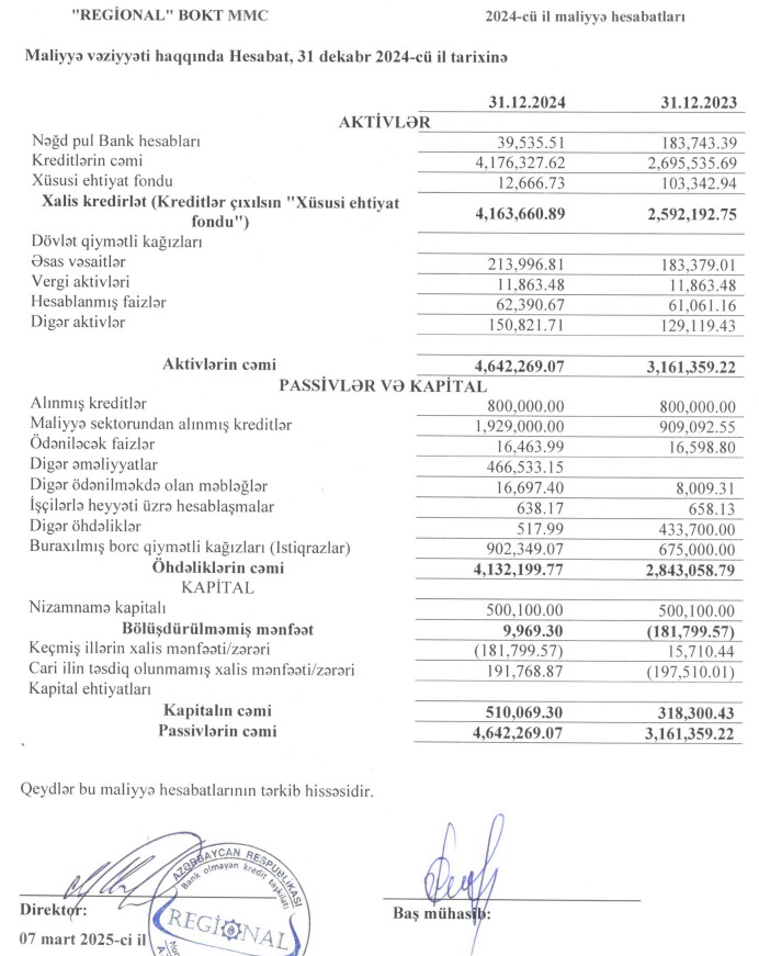 Ötən il “Regional” BOKT MMC-nin kredit portfeli (müştərilərə verilmiş kreditlər) 1 milyon 481 min manat və ya 55% artaraq 31 dekabr 2024-cü il tarixində 4 milyon 176 min manata çatıb.