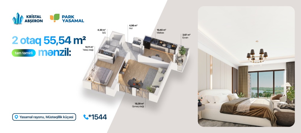 Bəli, bu artıq mümkündür! "Kristal Abşeron"un "Park Yasamal" yaşayış kompleksi sizə tam təmirli təhvil veriləcək mənzilləri faizsiz, komissiyasız, daxili kreditlə təqdim edərək, arzuladığınız mənzilə sahib olmaq şansını əlçatan edir.