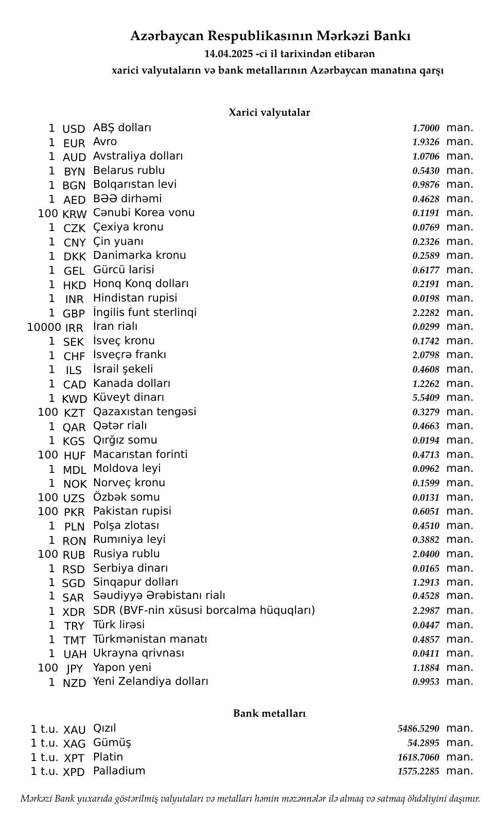 Dolların bazar ertəsi üçün rəsmi məzənnəsi müəyyən olunub
