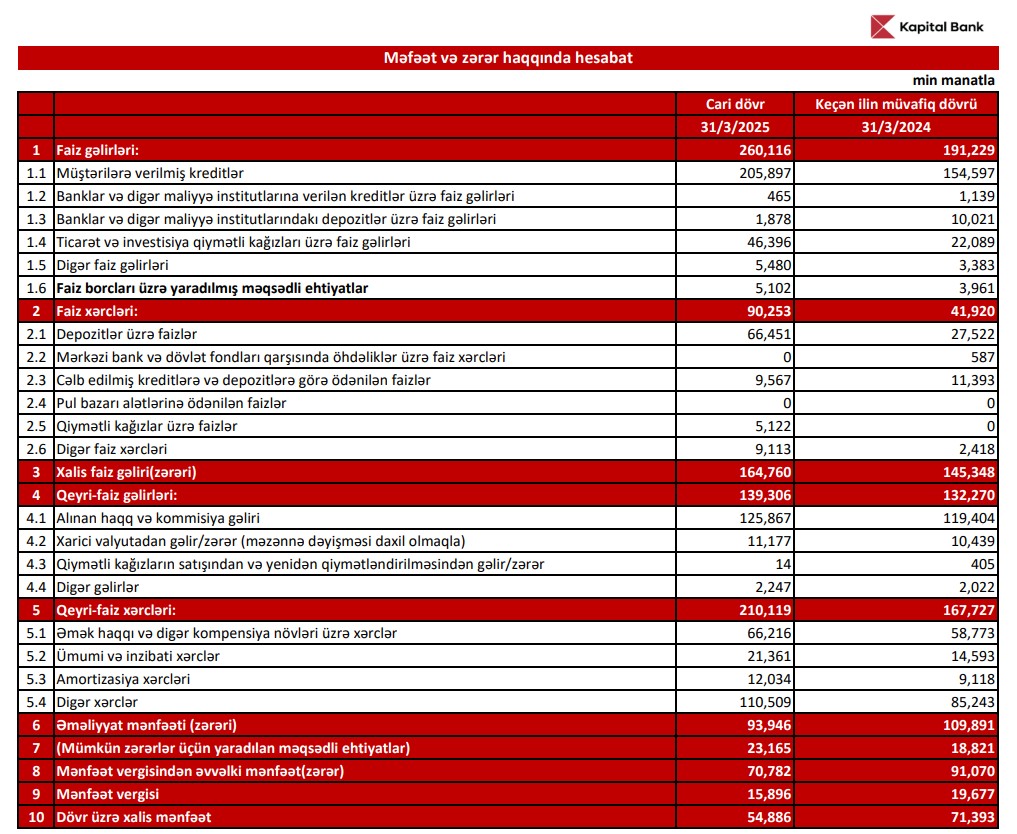 "Kapital Bank" ASC 2025-ci ilin 1-ci rübünü 54 milyon 886 min manat xalis mənfəət ilə başa vurub. Bank 2024-cü ilin 1-ci rübünü 71 milyon 393 min manat xalis mənfəət ilə bağlamışdı. Beləliklə, "Kapital Bank"ın xalis mənfəəti 2025-ci ilin 1-ci rübündə 2024-cü ilin 1-ci rübü ilə müqayisədə 16 milyon 507 min manat və ya 23,1% azalıb. Xalis mənfəətin azalmasının əsas səbəbi "Kapital Bank"ın faiz xərclərinin, əsasən də depozitlər üzrə faiz xərclərinin artması ilə əlaqədardır.