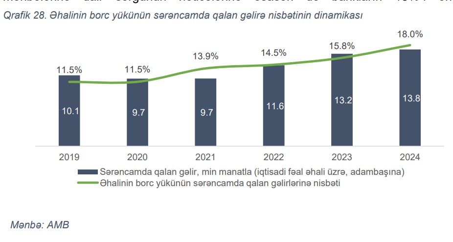"Əhalinin sərəncamda qalan gəlirlərində müsbət artım dinamikası müşahidə edilsə də, əhalinin borc yükünün sərəncamda qalan gəlirdə payının artımı müşahidə edilir. Belə ki əhalinin borc yükünün sərəncamda qalan gəlirlərinə nisbəti ötən ilin sonu ilə müqayisədə 2.2 faiz bəndi artaraq 18% olmuşdur. Banklar arasında keçirilən kreditləşmə fəaliyyəti və maliyyələşmə mənbələrinə dair sorğunun nəticələrinə əsasən də bankların 15%-i əhalinin borclanmasında orta dərəcədə artım olduğunu bildirib. Əhalinin borclanması dinamikası Mərkəzi Bank tərəfindən diqqət mərkəzində saxlanılır və bu istiqamətdə tənzimləmə siyasəti formalaşdırılır.