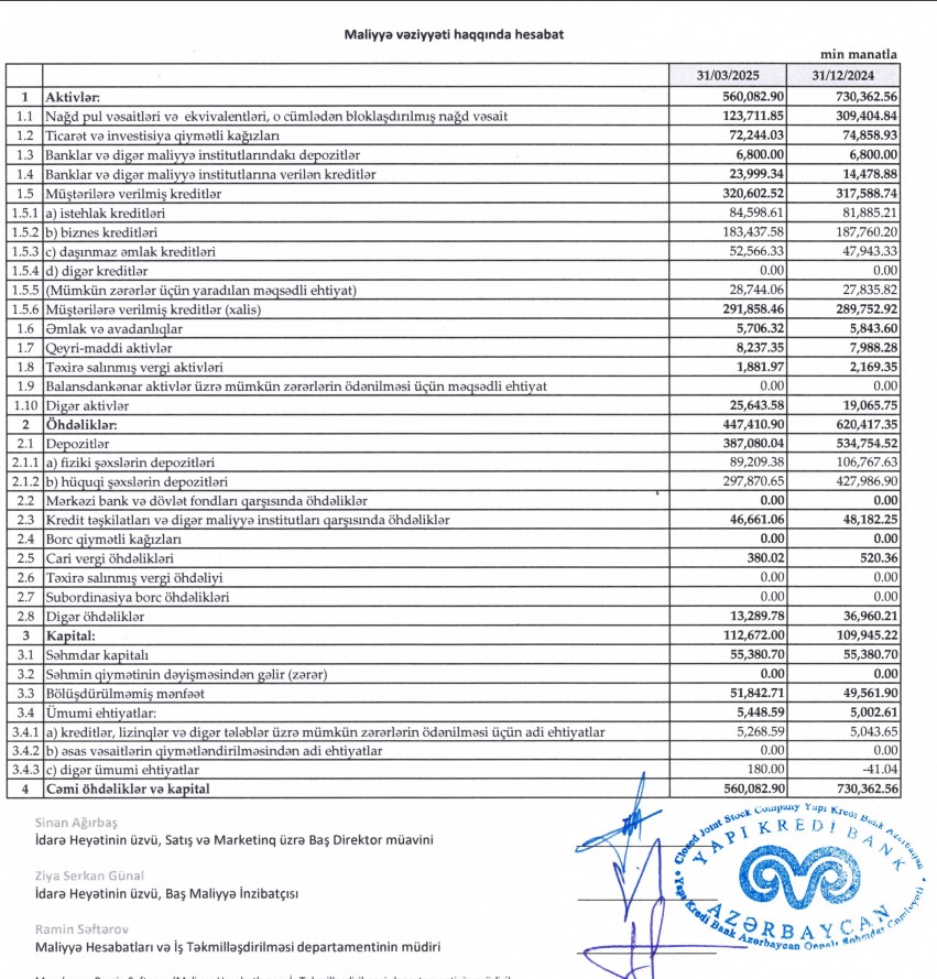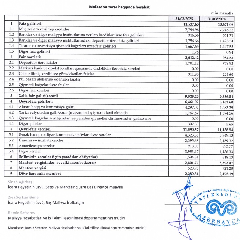 Yapı Kredi Bank Azərbaycan 2025-ci ilin birinci rübü üzrə maliyyə nəticələrini açıqlayıb.
