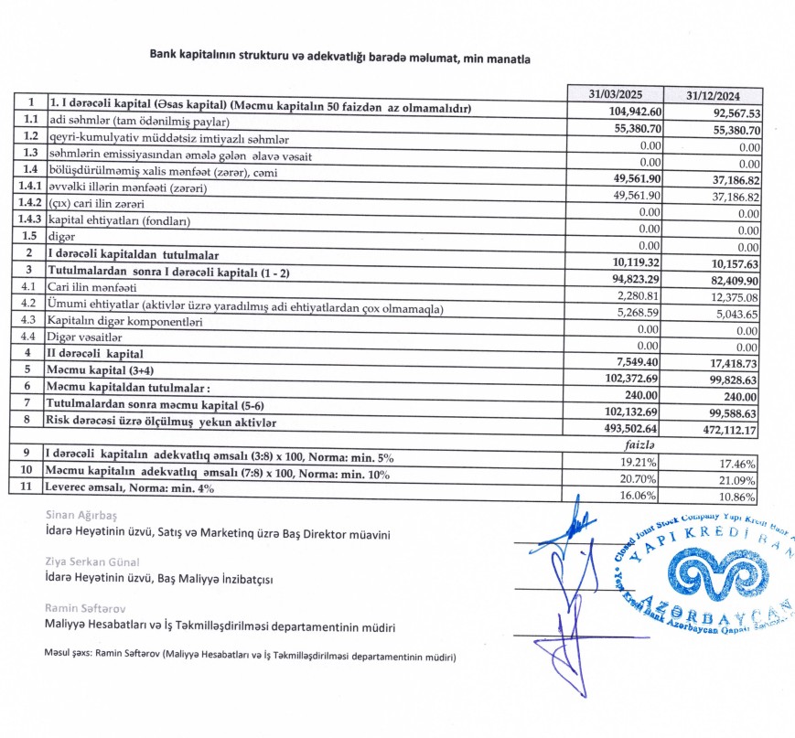 2025-cü ilin 1-ci rübünün yekunlarına dair göstəricilərinə əsasən Yapı Kredi Bank Azərbaycan Mərkəzi Bankı tərəfindən müəyyən olunmuş prudensial normativləri lazımı səviyyədə yerinə yetirmişdir. Belə ki, müvafiq dövrün sonuna bankın I dərəcəli kapitalının adekvatlıq əmsalı 19%, məcmu kapitalının adekvatlıq əmsalı isə 21% olmuşdur.