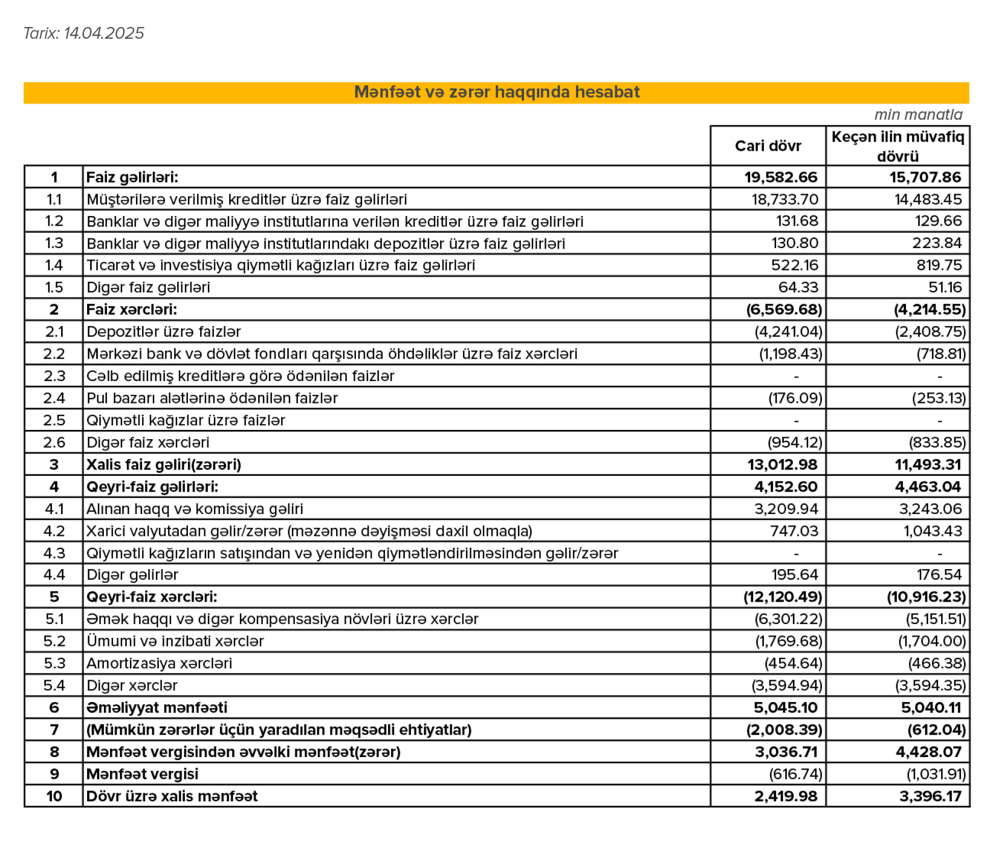 "Expressbank"da fiziki şəxslərin depozitləri 16 milyon 350 min manat artaraq 31 mart 2025-ci il tarixində 218 milyon 669 min manat təşkil edib.