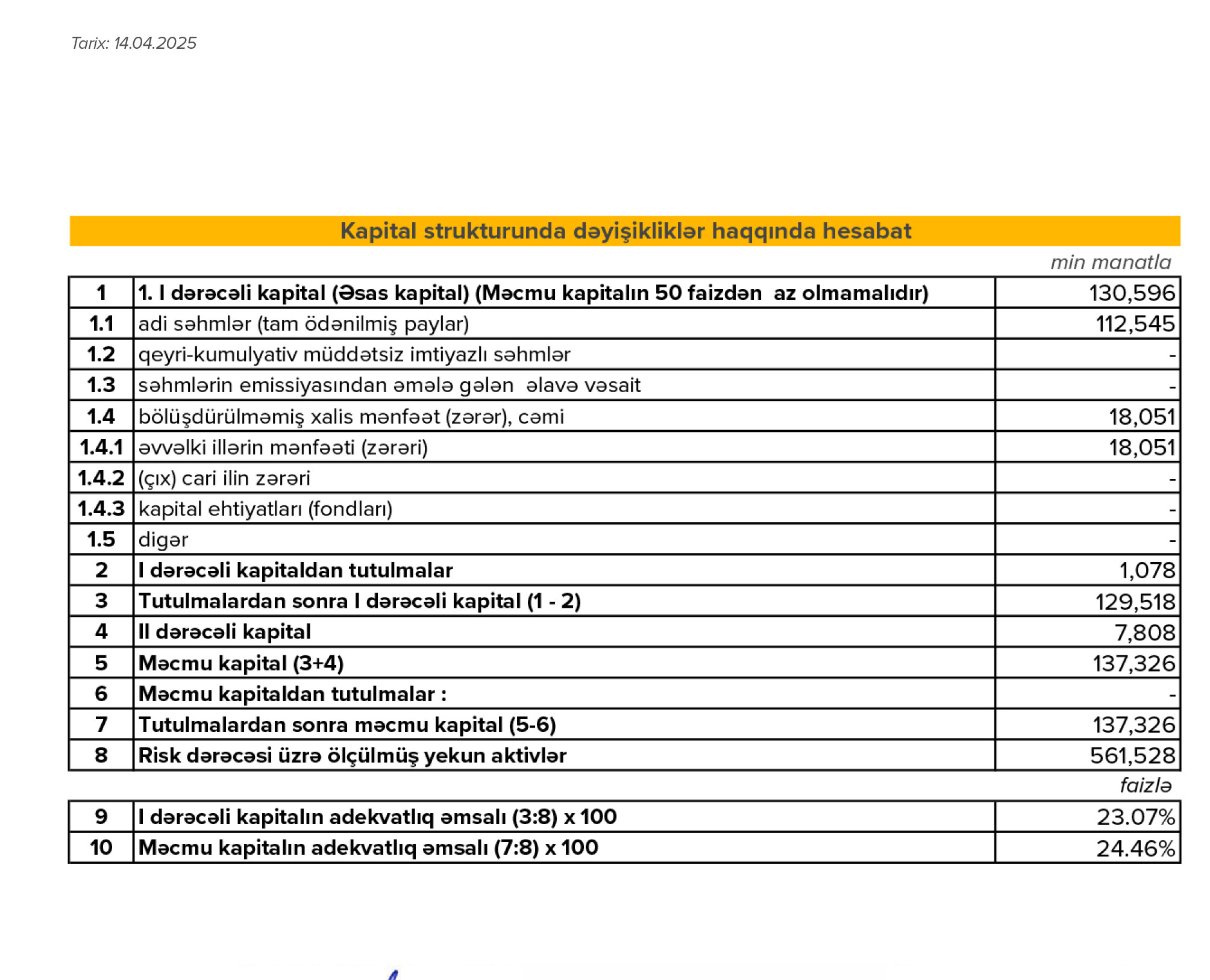 31 mart 2025-ci il tarixində "Expressbank" 137 milyon 326 min manat məcmu kapitala malik olub.