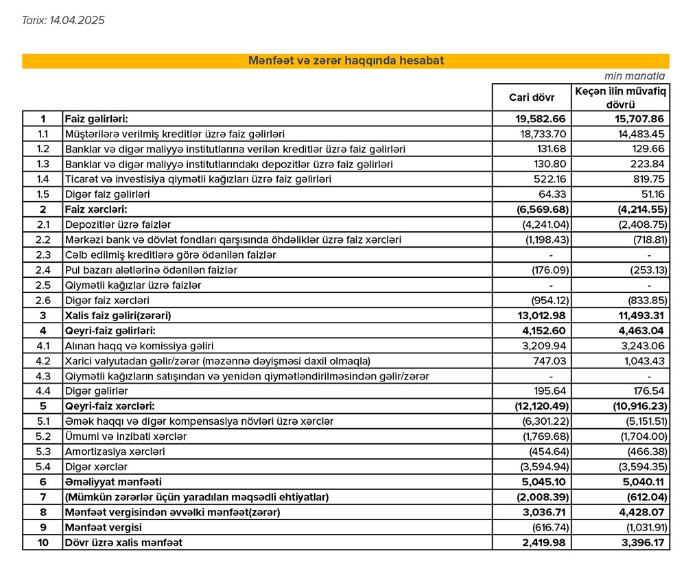 “Expressbank” ASC 2025-ci ilin 1-ci rübünü (yanvar - mart) 2 milyon 420 min manat xalis mənfəət ilə başa vurub. Bank 2024-cü ilin 1-ci rübünü 3 milyon 396 min manat xalis mənfəət ilə bağlamışdı. Beləliklə, "Expressbank"ın xalis mənfəəti 2025-ci ilin 1-ci rübündə ötən ilin eyni dövrü ilə müqayisədə 976 min manat və ya 28,7% azalıb.
