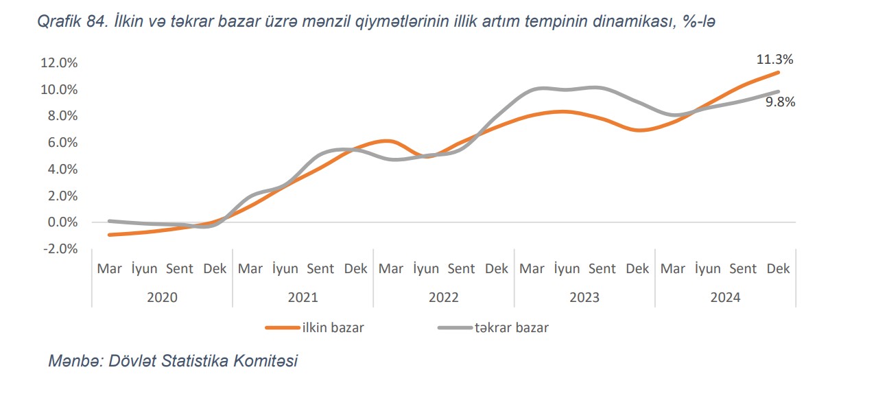 2024-cü ildə mənzil qiymətlərinin artım tempi sərəncamda qalan gəlirlərin artım tempini üstələmişdir. Belə ki, Dövlət Statistika Komitəsinin məlumatına əsasən, ötən ilin sonu ilə müqayisədə mənzil qiymətləri 9.9%, sərəncamda qalan gəlirlərin artım tempi isə 5.9% təşkil etmişdir. Ümumilikdə isə, 2020-ci ildən etibarən mənzil qiymətləri 32%, sərəncamda qalan gəlirlər isə 39% artmışdır.