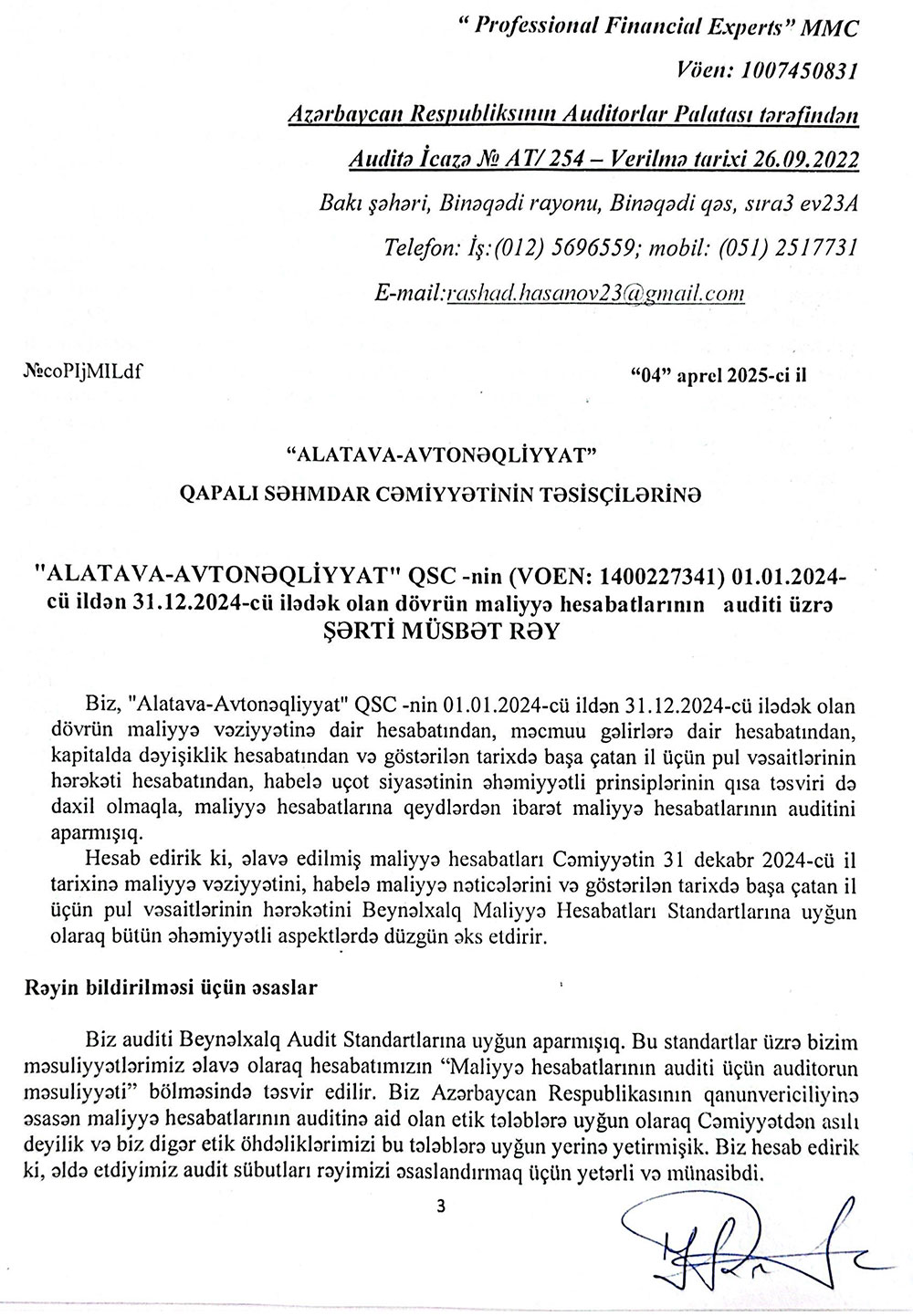 "Alatava-Avtonəqliyyat" QSC-nin 31 dekabr 2024-cü il tarixində başa çatan il üzrə maliyyə hesabatları.