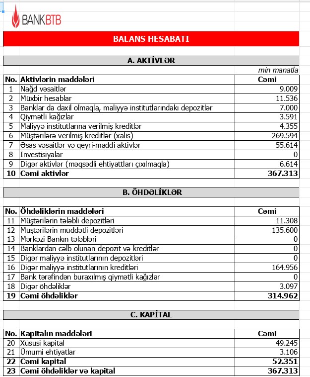2024-cü ilin sonu ilə müqayisədə ilk rübdə "Bank BTB"nin cəmi aktivləri 4 milyon 496 min manat və ya 1,2% artaraq 367 milyon 313 min manata çatıb Bankın cəmi kredit portfeli (müştərilərə verilmiş kreditlər) isə sabit qalıb və 31 mart 2025-ci il tarixində 269 milyon 594 min manat olub.