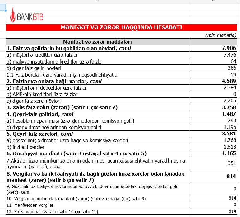 "Bank BTB" gəlirlərini artırıb, əməliyyat mənfəəti 1 milyon manatı aşıb