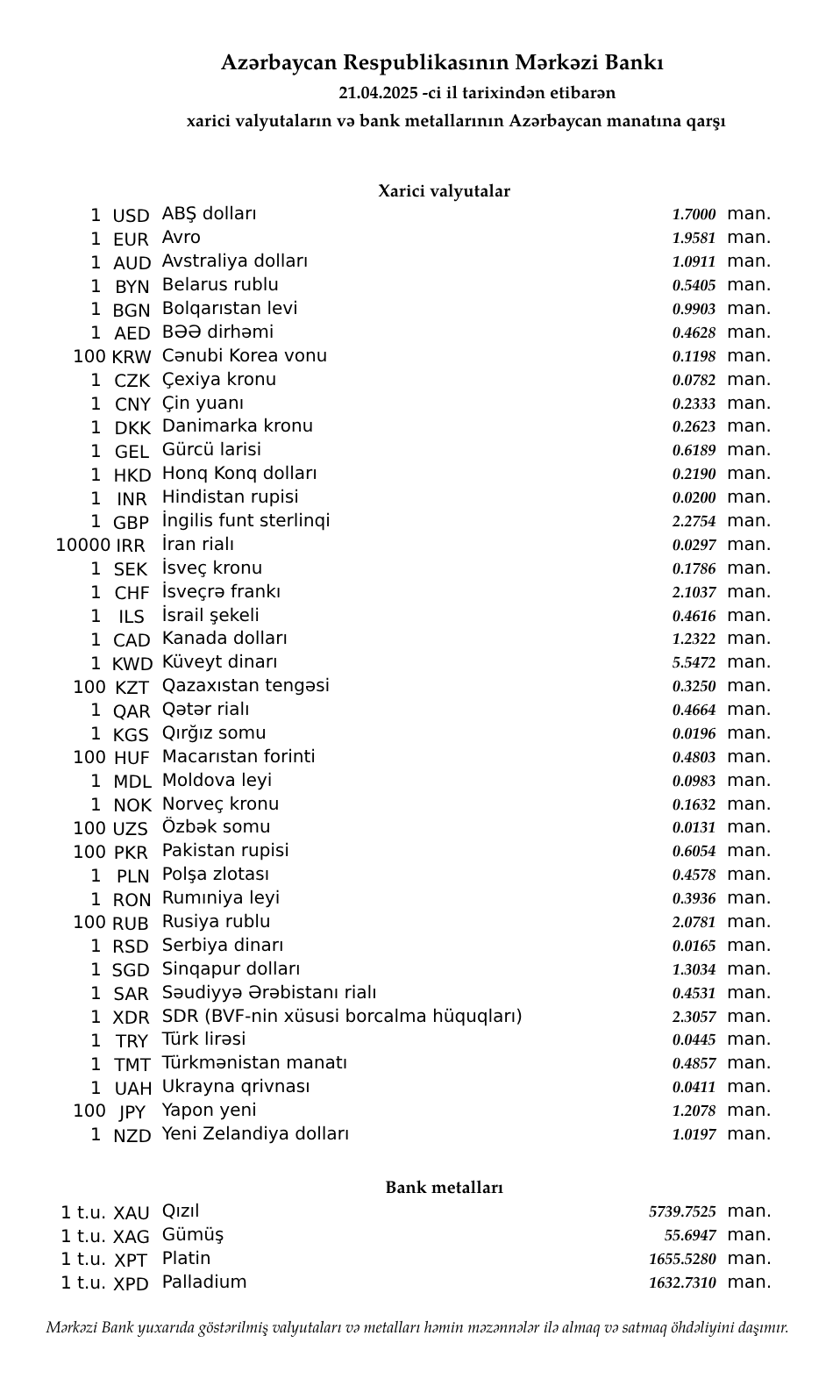 Dolların bazar ertəsi üçün rəsmi məzənnəsi müəyyən olunub