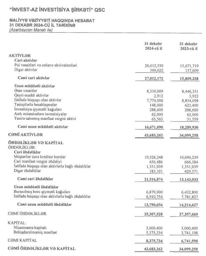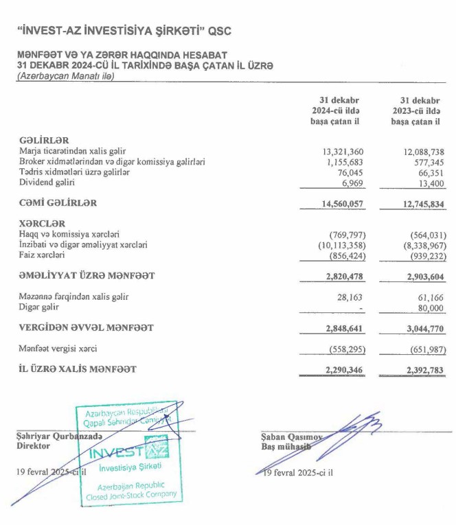 Marja.az Şirkətin illik maliyyə göstəricilərinə istinadən xəbər verir ki, "İnvest-AZ"ın cəmi gəlirləri 2023-cü ildə 12 milyon 746 min manat ikən, 2024-cü ildə 14 milyon 560 min manat təşkil edib (1 milyon 815 min manat və ya 14,2% artıb).