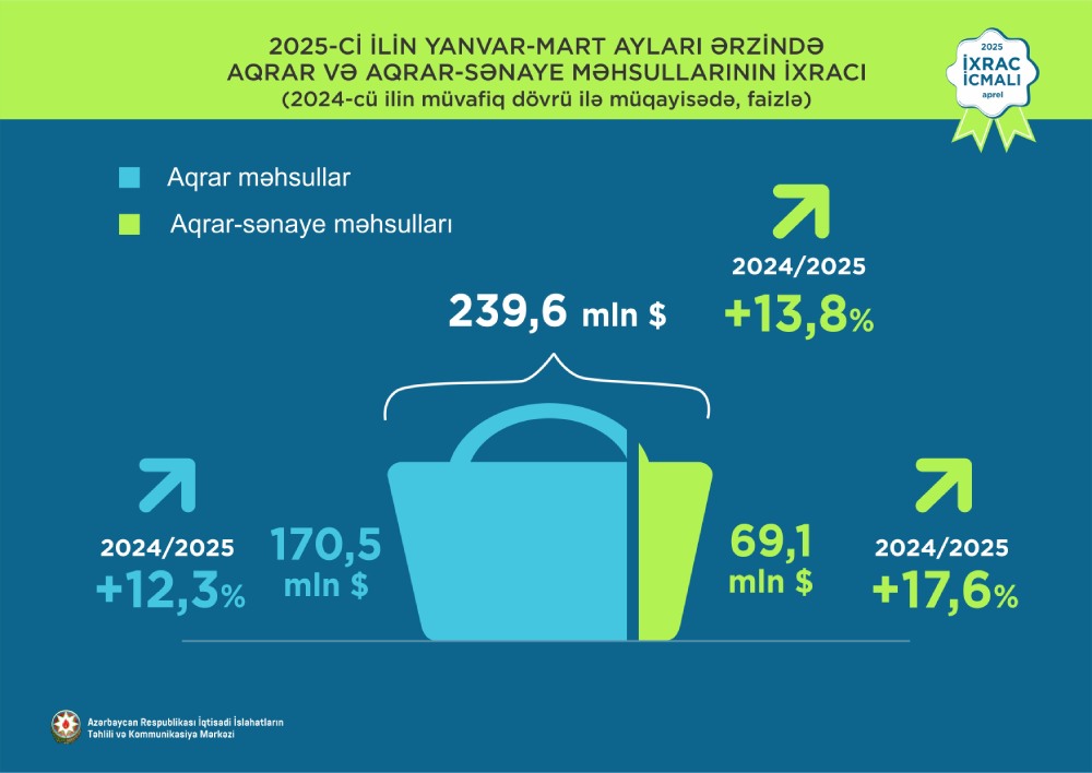 2025-ci ilin yanvar-mart aylarında aqrar məhsullar 12,3% artaraq 170,5 milyon ABŞ dolları, aqrar-sənaye məhsulları 17,6% artaraq 69.1 milyon ABŞ dollarına bərabər olub. Bütövlükdə aqrar və aqrar-sənaye məhsullarının birgə ixracı 13,8% artaraq 239,6 milyon ABŞ dolları təşkil edib.