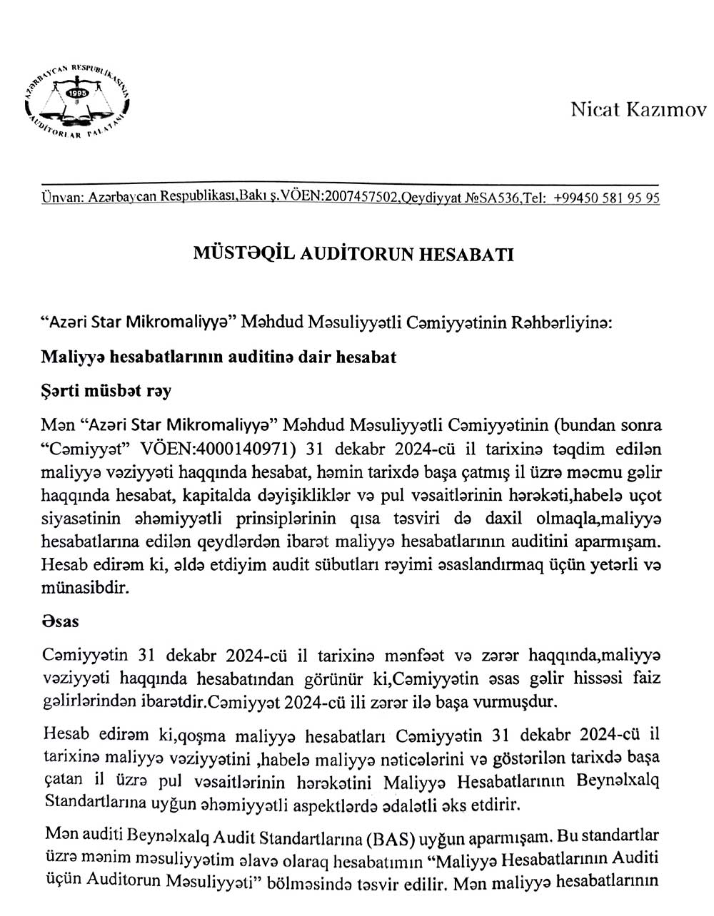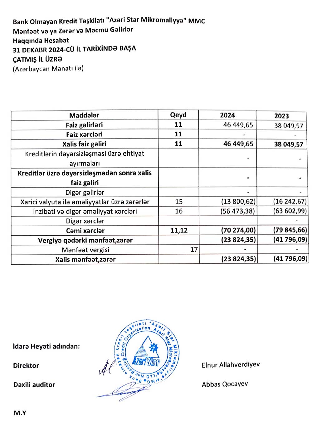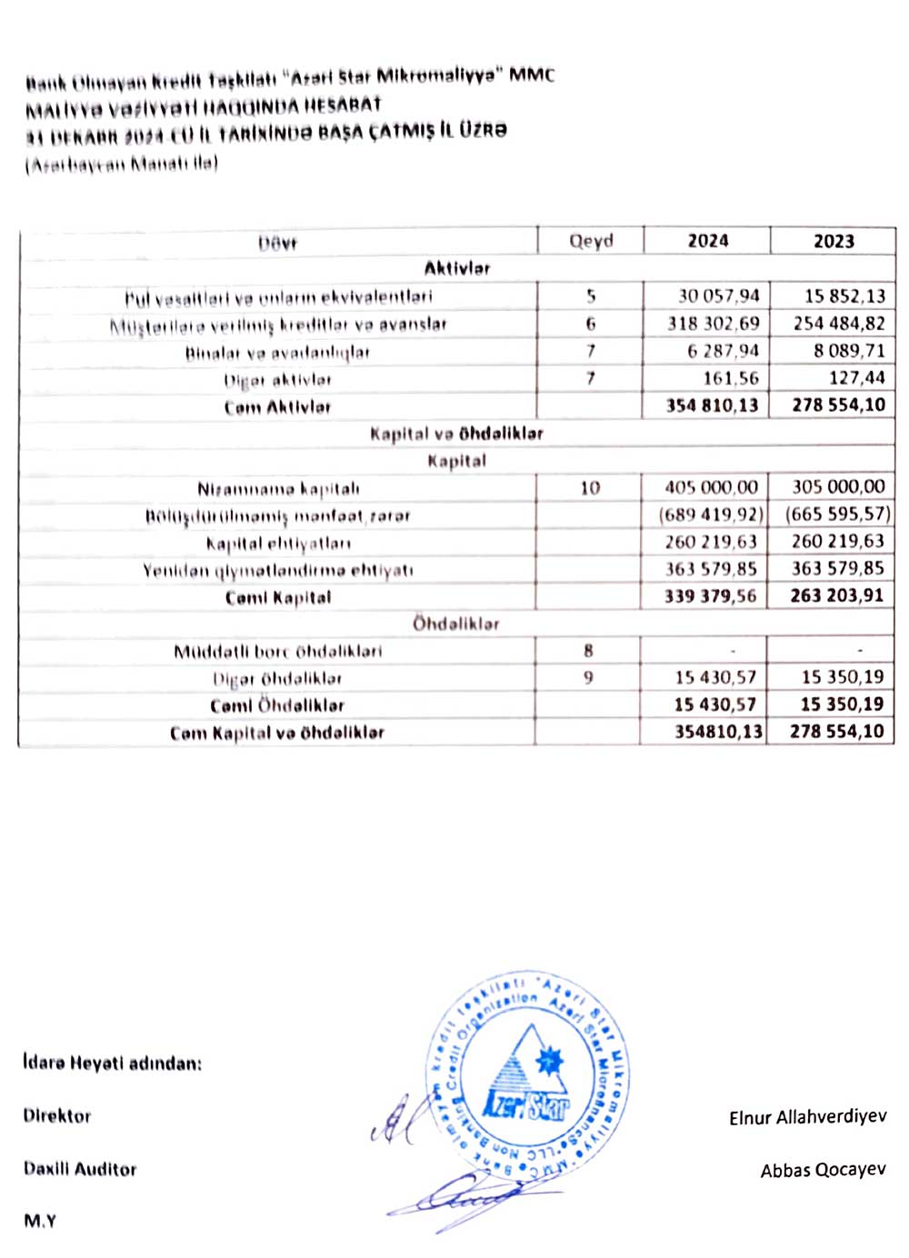 "Azəri-Star Mikromaliyyə" MMC-nin 2024-cü il üzrə maliyyə hesabatları