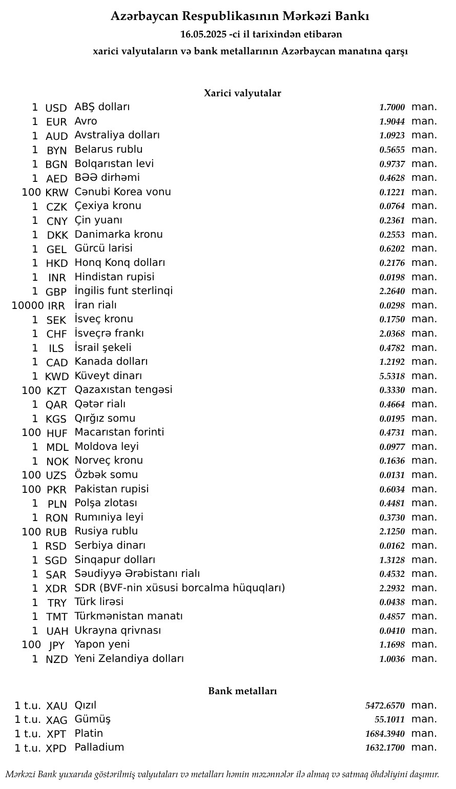 Rəsmi məzənnələr açıqlandı