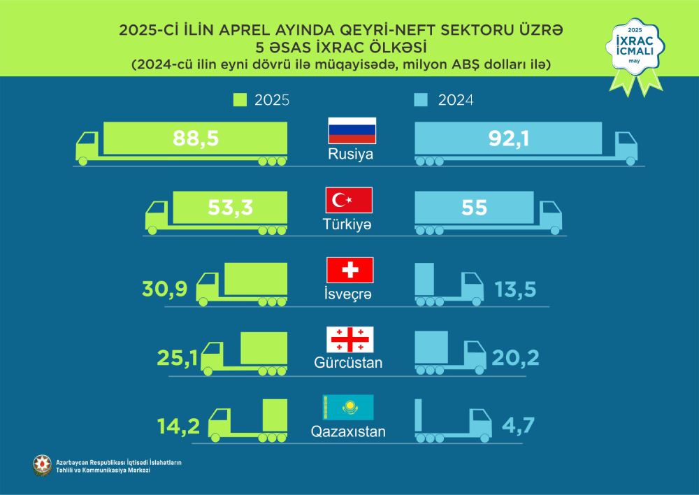 Cari ilin ilk dörd ayında Rusiya Federasiyasına 321,4 milyon ABŞ dolları, Türkiyəyə 187,7 milyon ABŞ dolları, Gürcüstana 105,8 milyon ABŞ dolları, İsveçrəyə 100,5 milyon ABŞ dolları, Ukraynaya isə 63 milyon ABŞ dolları dəyərində qeyri-neft sektoruna aid mal ixrac olunub.