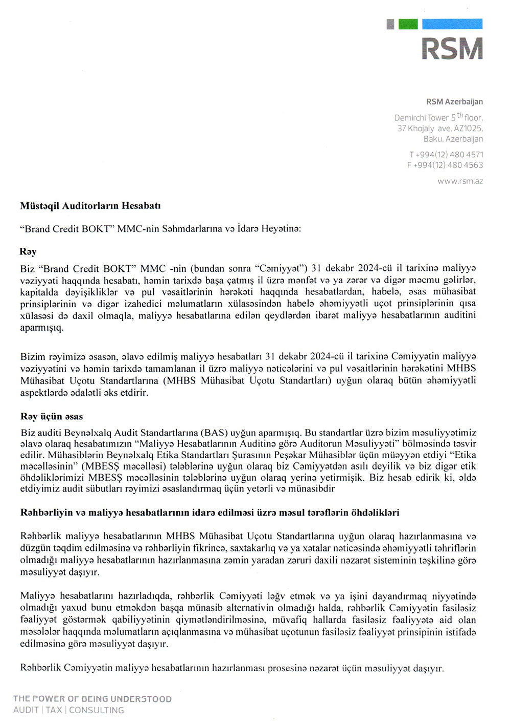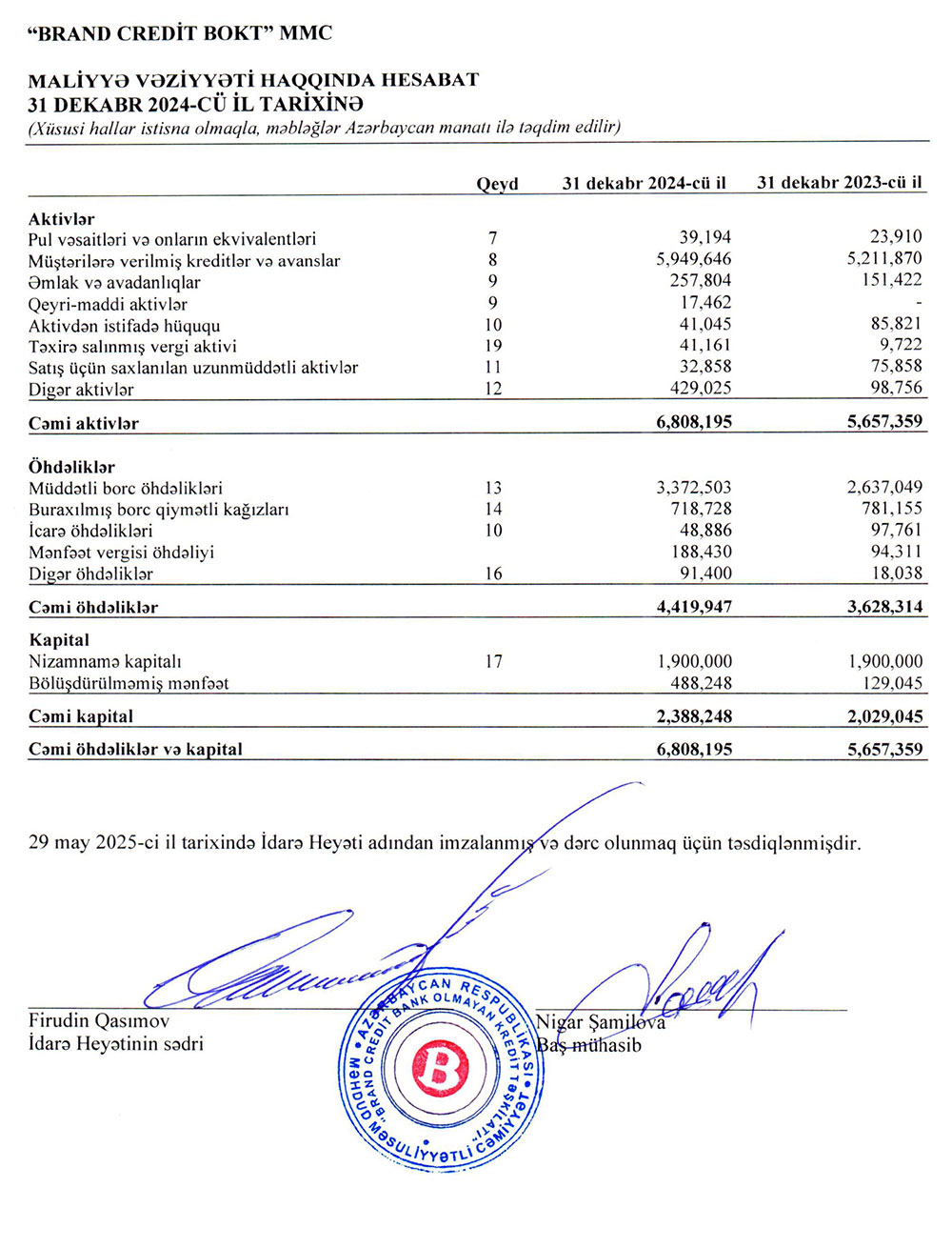 "Brand Credit Bank Olmayan Kredit Təşkilatı" MMC 31 dekabr 2024-cü il tarixində bitən il üzrə maliyyə hesabatları - ƏTRAFLI