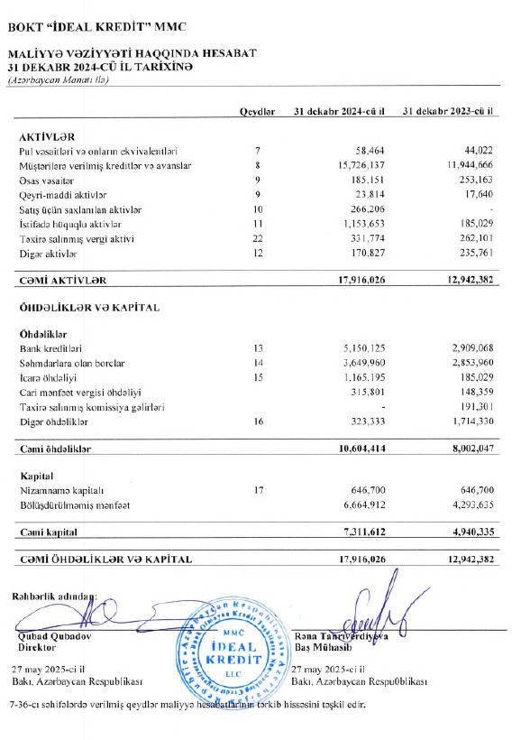 Keçən il BOKT "İdeal Kredit”in kredit portfeli (müştərilərə verilmiş kreditlər) 3 milyon 781 min manat və ya 31,6% artaraq 31 dekabr 2024-cü il tarixində 15 milyon 726 min manata çatıb. Təşkilat 2023-cü ilin sonunda 11 milyon 945 min manat kredit portfelinə malik idi.