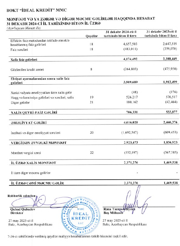Marja.az Təşkilatın maliyyə hesabatlarına istinadən xəbər verir ki, BOKT "İdeal Kredit”in faiz gəlirləri 2023-cü ildə 2 milyon 647 min manat ikən, 2024-cü ildə 4 milyon 657 min manata yükəlib (2 milyon 10 min manat və ya 76% artıb).