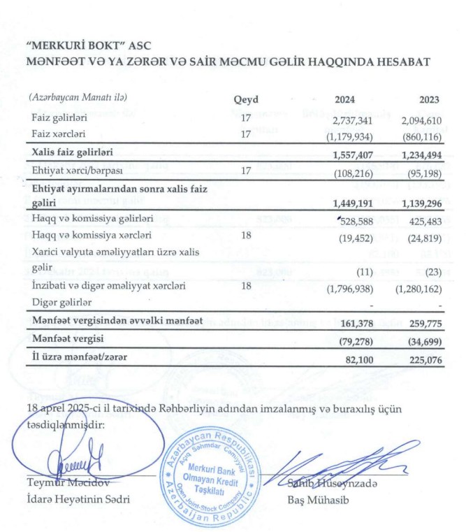635"Merkuri Bank Olmayan Kredit Təşkilatı" ASC 2024-cü ili 82 min manat xalis mənfəət ilə başa vurub. BOKT 2023-cü ili 225 min manat xalis mənfəət ilə bağlamışdı. Beləliklə, ötən il "Merkuri BOKT"ın xalis mənfəəti 143 min manat və ya 63,5% azalıb.