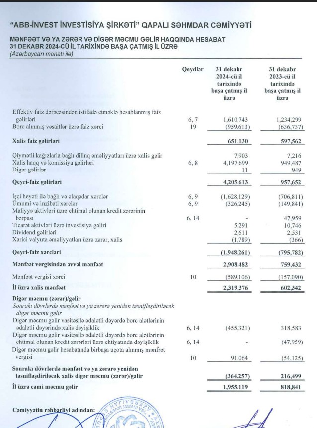 Marja.az Şirkətin illik maliyyə hesabatına istinadən xəbər verir ki, "ABB-İnvest"in faiz gəlirləri 2023-cü ildə 1 milyon 234 min manat, qeyri-faiz gəlirləri 958 min manat ikən, 2024-cü ildə müvafiq olaraq 1 milyon 611 min manat və 4 milyon 206 min manat təşkil edib. Qeyri-faiz gəlirlərinin kəskin artmasına xalis haqq və komissiya gəlirlərinin 4,4 dəfə artaraq 4 milyon 198 min manata yüksəlməsi səbəb olub.