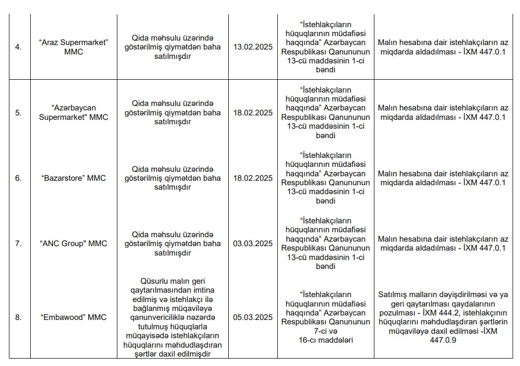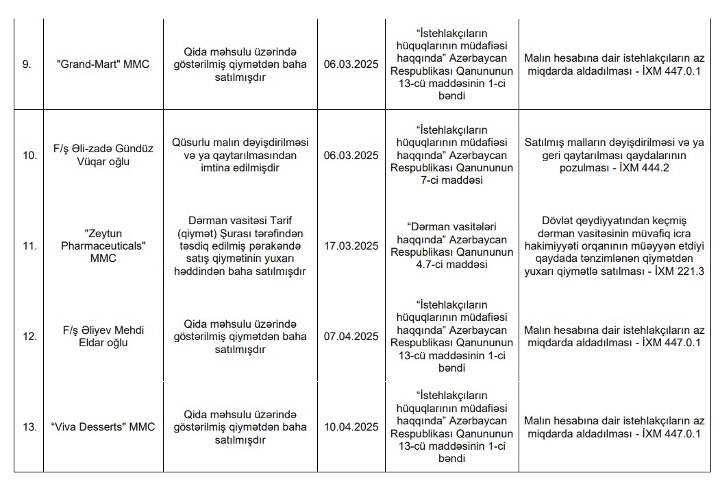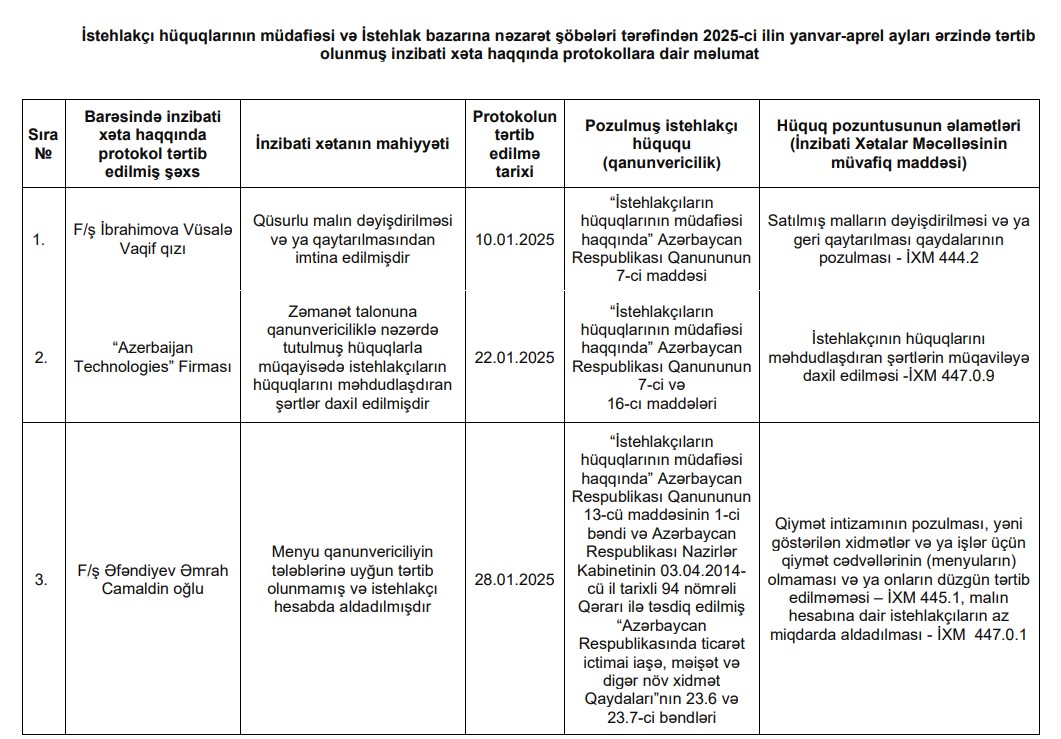 Azərbaycan Respublikasının Prezidenti yanında Antiinhisar və İstehlak Bazarına Nəzarət Dövlət Agentliyi İstehlakçı hüquqlarının müdafiəsi və İstehlak bazarına nəzarət şöbələri tərəfindən 2025-ci ilin yanvar-aprel ayları ərzində tərtib olunmuş inzibati xəta haqqında protokollara dair məlumat yayıb.