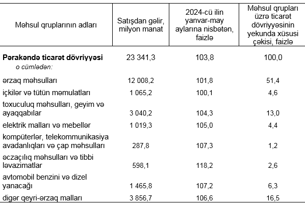 2025-ci ilin yanvar-may aylarında alıcıların pərakəndə ticarət şəbəkəsində aldıqları mallara xərclədiyi vəsaitin 51,4 faizi ərzaq məhsullarının, 4,6 faizi içkilər və tütün məmulatlarının, 13,0 faizi toxuculuq məhsulları, geyim və ayaqqabıların, 6,3 faizi avtomobil benzini və dizel yanacağının, 4,4 faizi elektrik malları və mebellərin, 2,6 faizi əczaçılıq məhsulları və tibbi ləvazimatların, 1,2 faizi kompüterlər, telekommunikasiya avadanlıqları və çap məhsullarının, 16,5 faizi isə digər qeyri-ərzaq mallarının alınmasına sərf olunmuşdur.
