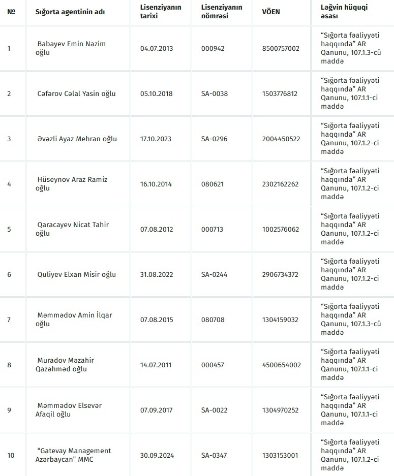 “Sığorta fəaliyyəti haqqında” Azərbaycan Respublikası Qanununun 107.1.1-ci, 107.1.2-ci və 107.1.3-cü maddələrinə əsasən lisenziyaları ləğv edilən sığorta agentlərinin SİYAHISI