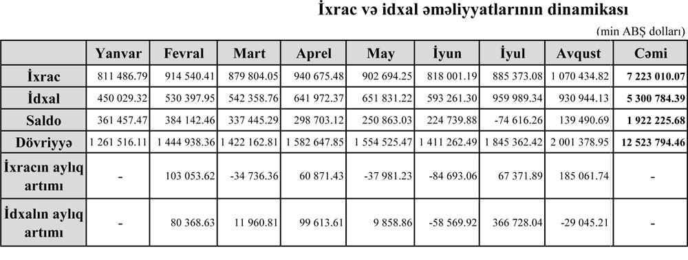 İdxal əməliyyatları üzrə 5 milyard 300 milyon 784.39 min ABŞ dolları (Keçən ilin müvafiq dövrünə nisbətən 4.22% azalmışdır), ixrac əməliyyatları üzrə 7 milyard 223 milyon 10.07 min ABŞ dolları (Keçən ilin müvafiq dövrünə nisbətən 12.60% azalmışdır) dövriyə qeydə alınıb. İdxalın azalması ilin ilk aylarında idxalın aşağı olması ilə bağlıdır. İyul və Avqust aylarında idxal kəskin artıb.