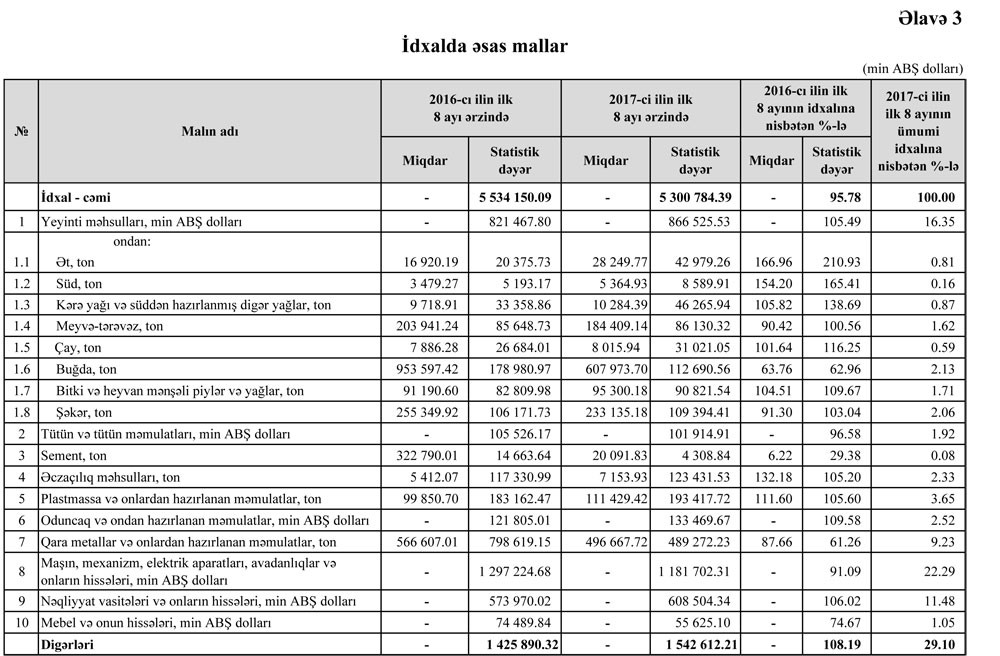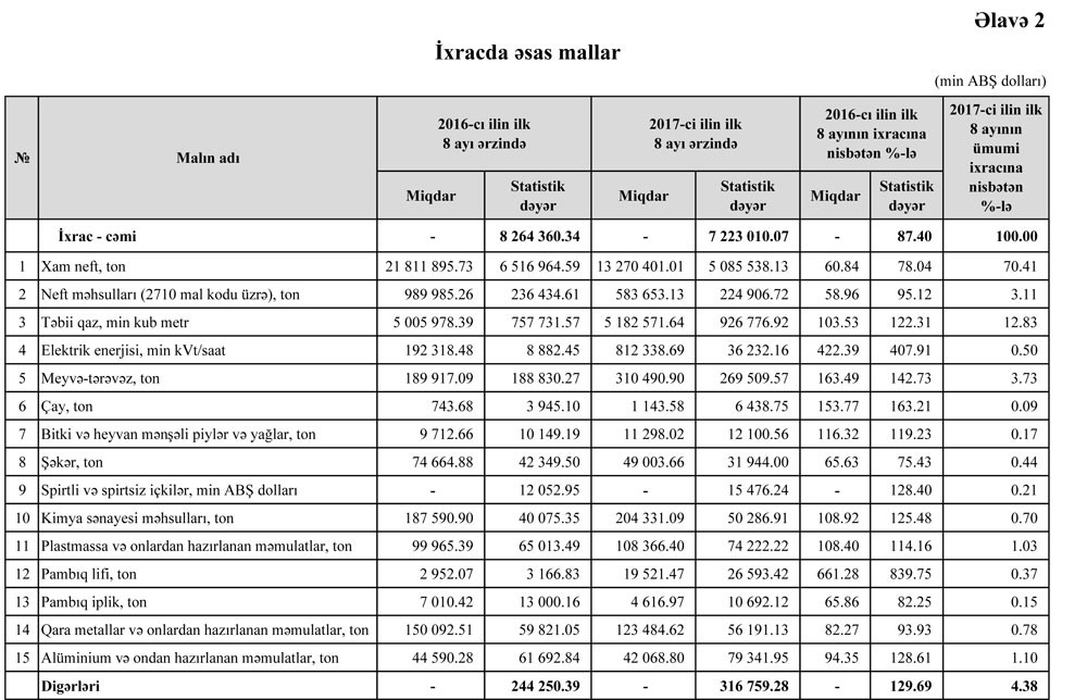 2017-ci ilin yanvar-avqust ayları ərzində Azərbaycanın ticarət əməliyyatlarının həcmi 12 milyard 523 milyon 794.46 min ABŞ dolları təşkil edib.