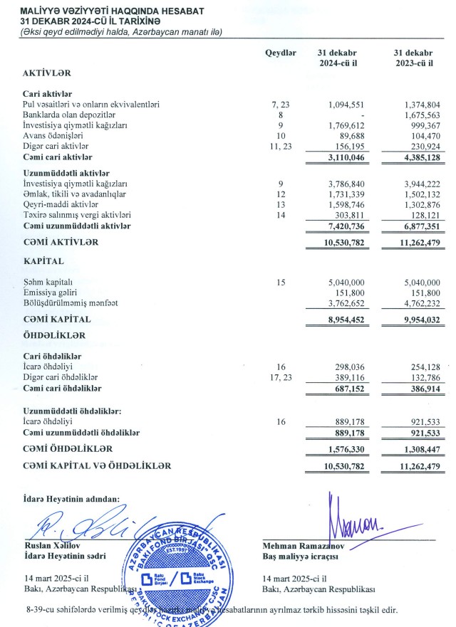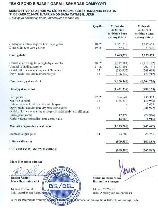 "Bakı Fond Birjası" QSC 2024-cü ili 999 min 580 manat xalis zərər ilə başa vurub. Halbuki, Birja 2023-cü ili 367 min 887 manat xalis zərər ilə bağlamışdı.