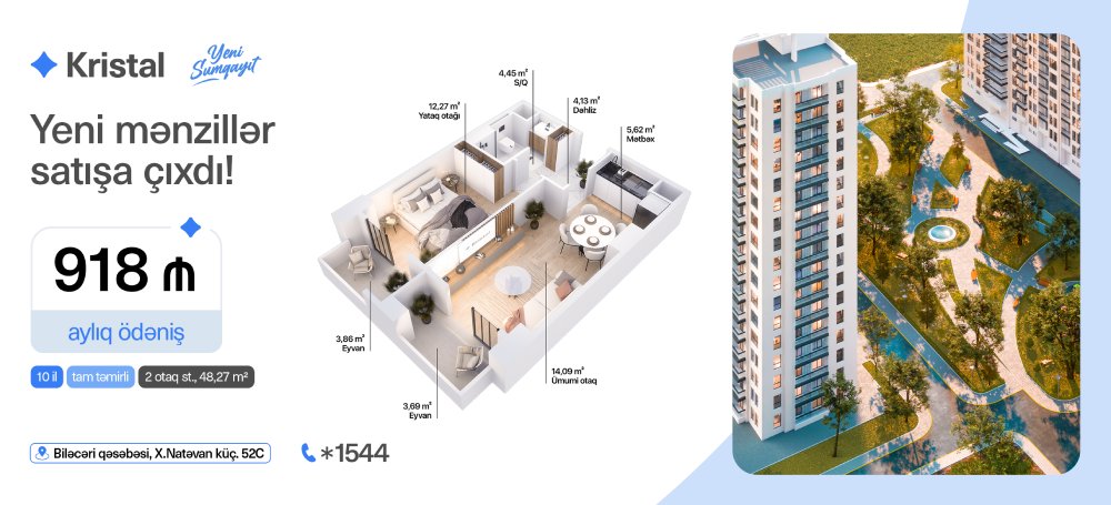 (®) "Kristal" "Biləcəri" yaşayış kompleksində yeni, məhdud sayda mənzilləri satışa çıxardı!