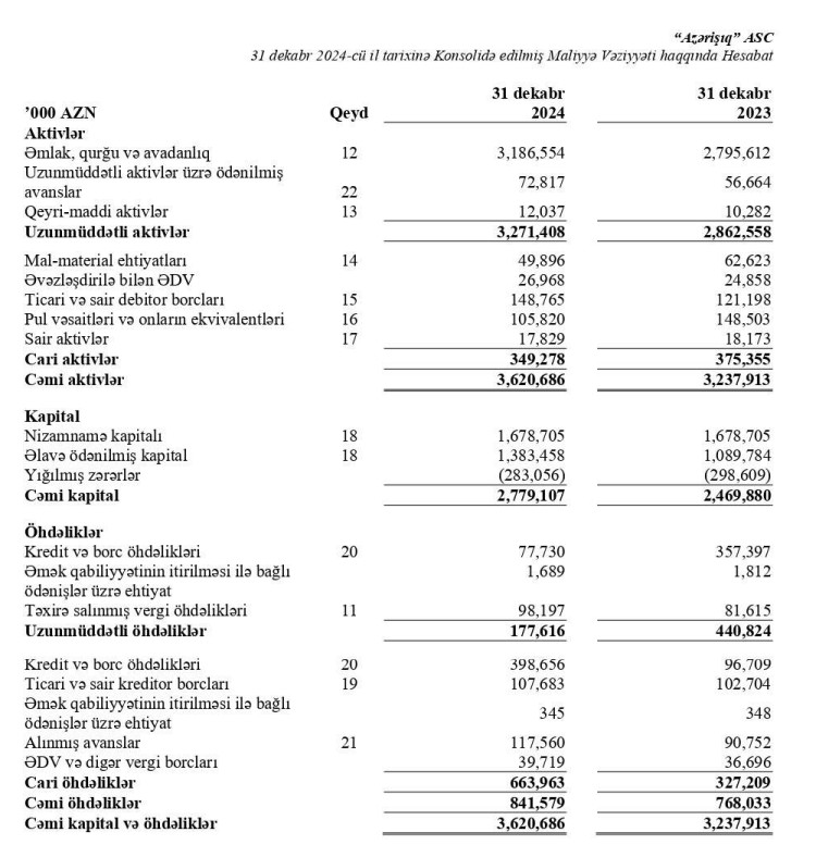 31 dekabr 2024-cü il tarixində "Azərişıq" ASC 3 milyard 620 milyon 686 min manat cəmi aktivlərə malik olub. Şirkət 2023-cü ilin sonunda 3 milyard 237 milyon 913 min manat cəmi aktivlərə malik idi.