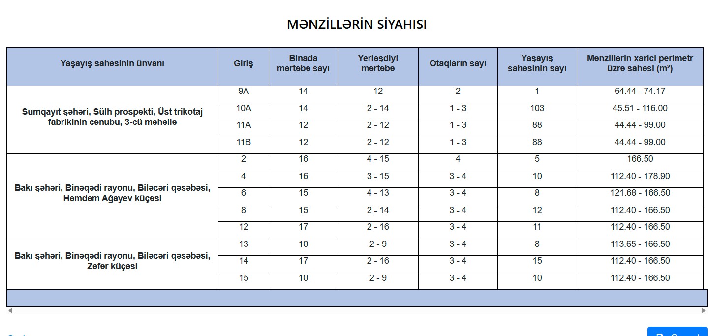 Yeni mənzillər seçim üçün 14.07.2025-ci il tarixində saat 15:00-dan etibarən açıq olacaq. Vətəndaşlar təqdim olunan yaşayış sahələrinin siyahısı ilə aşağıdakı cədvəldən tanış ola bilərlər.