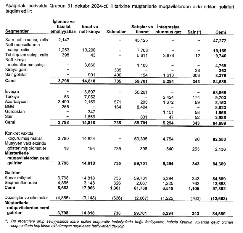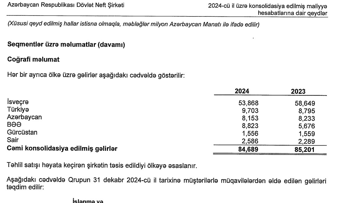 SOCAR gəlirinin 64 faizini İsveçrədə əldə edib2024-cü ildə SOCAR 84 milyard 689 milyon manat əsas əməliyyat gəlirlərinin 63,6%-ni və ya 53 milyard 868 milyon manatını İsveçrədə əldə edib.