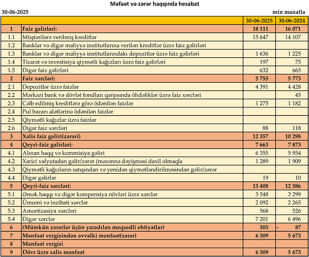 Ötən ilin 6 ayında Bankın cəmi əməliyyat gəlirləri 23 milyon 944 min manat, cəmi əməliyyat xərcləri 18 milyon 359 min manat, əməliyyat mənfəəti 5 milyon 585 min manat, eyni zamanda, mümkün zərərlər üçün yaradılan məqsədli ehtiyatlardan azad olmuş 87 min manat mənfəətə əlavə olunduğundan 5 milyon 673 manat xalis mənfəət əldə etmişdir.