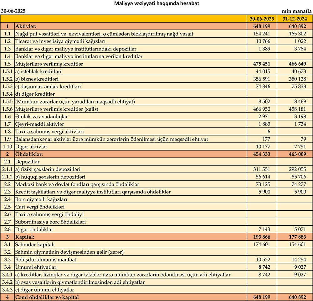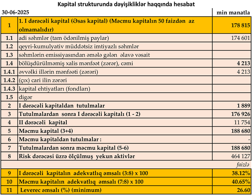 Bankın Səhmdar kapitalı ilin əvvəli ilə müqaisədə 20 milyon manat artmışdır. Yeni səhmlərin emissiyası və yerləşdirilməsi nəticəsində Bankın maliyyə dayanıqlığı yüksək səviyyədə saxlanılmışdır. 30.06.2025-ci il tarixinə bankın nizamnamə kapitalı 174 milyon 601 min manat, məcmu kapitalı isə 188 milyon 680 min manat təşkil etmişdir.