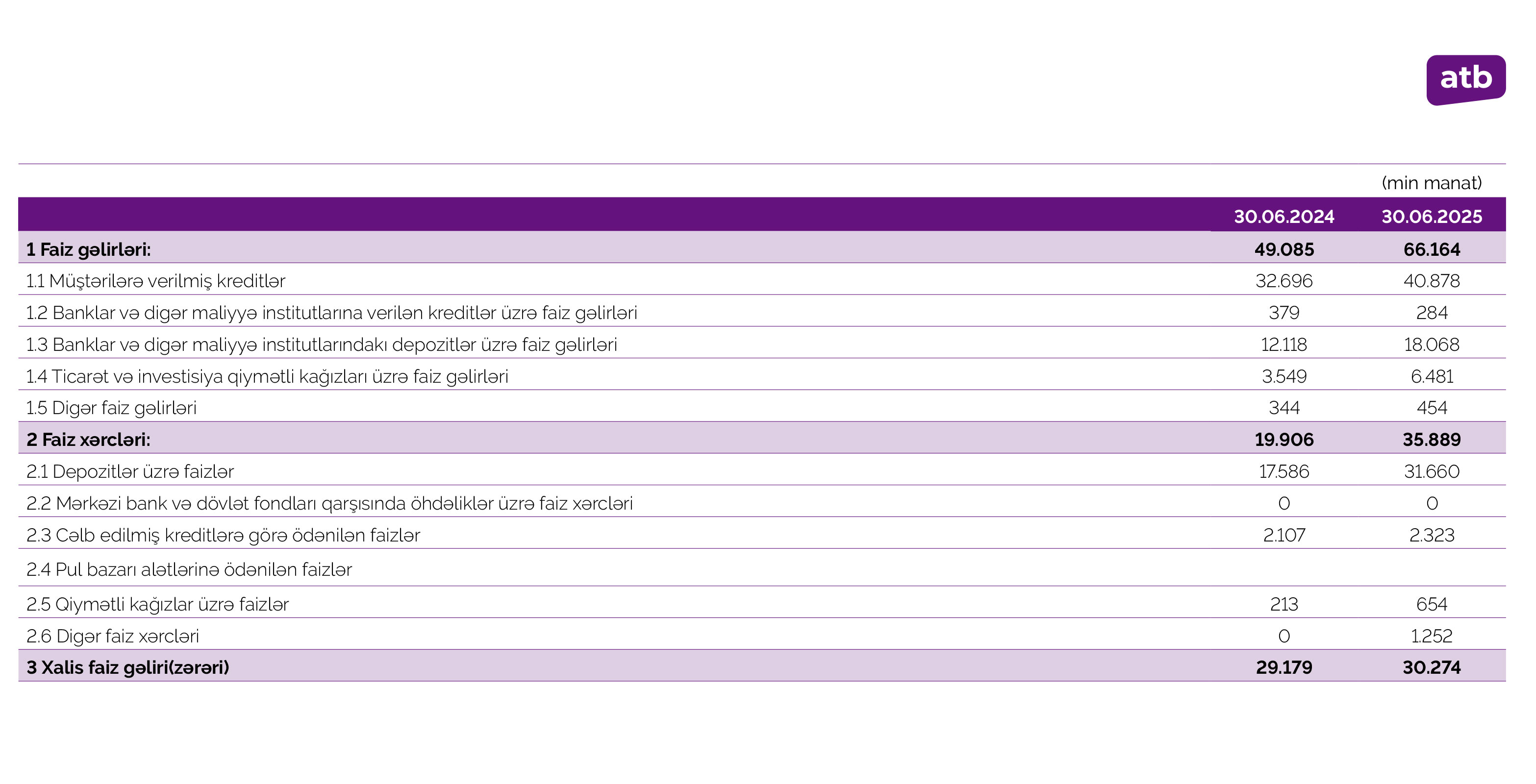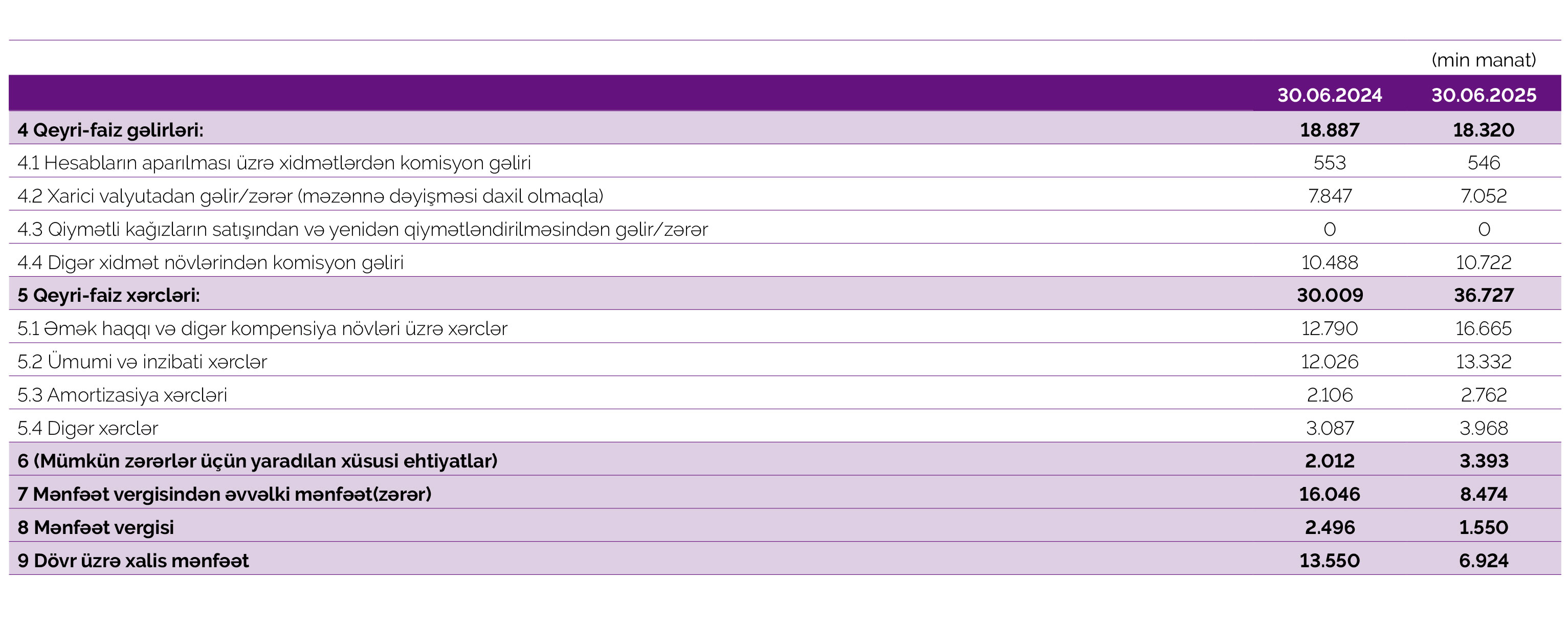 Müqayisə üçün qeyd edək ki, 2024-cü ilin 1-ci yarısında “Azər-Türk Bank” ASC-nin cəmi əməliyyat gəlirləri (faiz və qeyri-faiz gəlirləri) 67 milyon 972 min manat, əməliyyat xərcləri (faiz və qeyri-faiz xərcləri) 49 milyon 915 min manat, gəlirlər xərcləri üstələdiyindən əməliyyat mənfəəti 18 milyon 57 min manat təşkil etmişdi. Bank əməliyyat mənfəətindən 2 milyon 12 min manat mümkün zərərlər üçün yaradılan xüsusi ehtiyatlara ayırmış, 2 milyon 496 min manat mənfəət vergisi ödəmişdi.