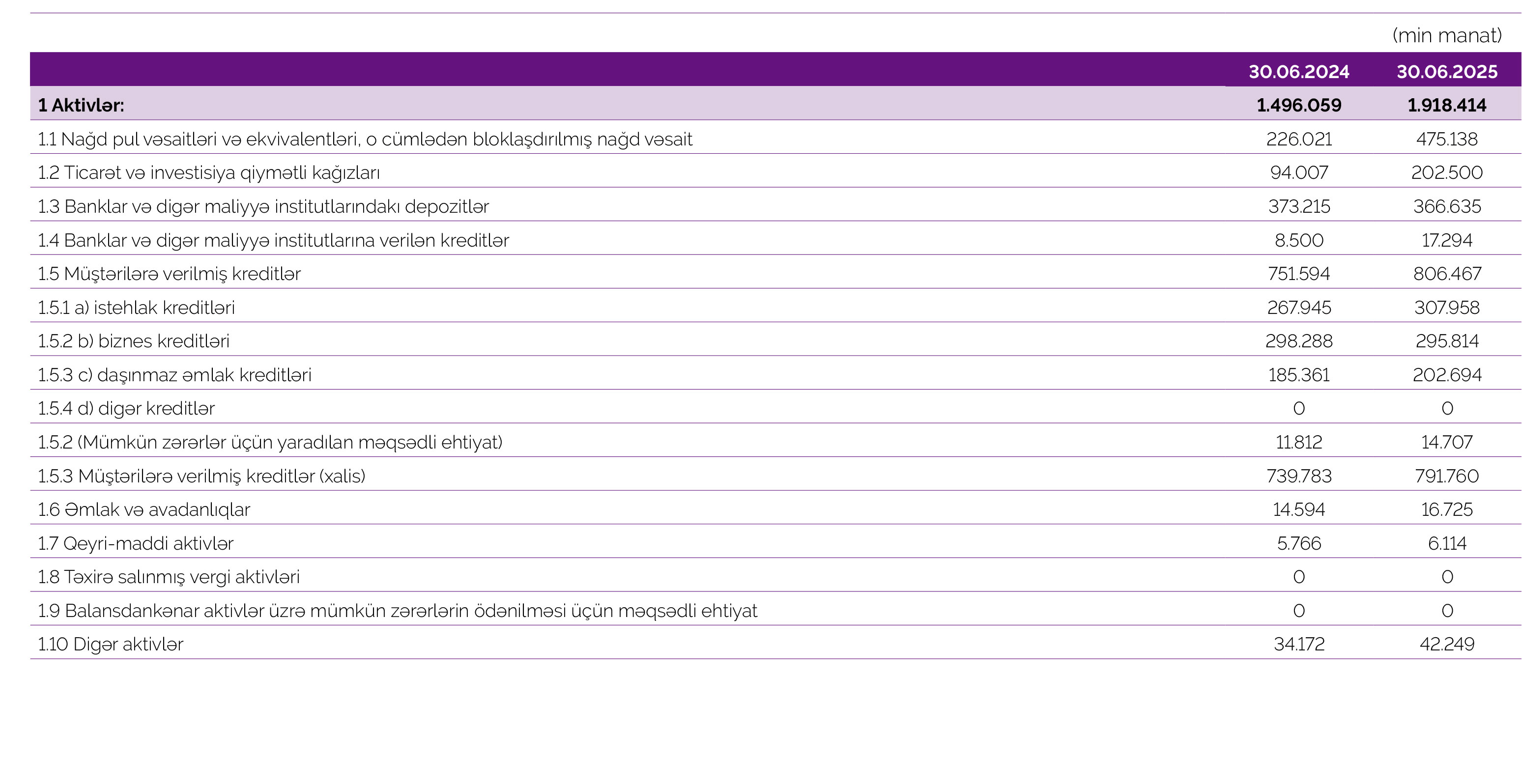 2024-cü ilin İyun ayının sonu ilə müqayisədə “Azər-Türk Bank”ın cəmi aktivləri 422 milyon 355 min manat və ya 28,2% artaraq 1 milyard 918 milyon 414 min manata, o cümlədən kredit portfeli (müştərilərə verilmiş kreditlər) 54 milyon 873 min manat və ya 7,3% artaraq 806 milyon 467 min manata yüksəlib.