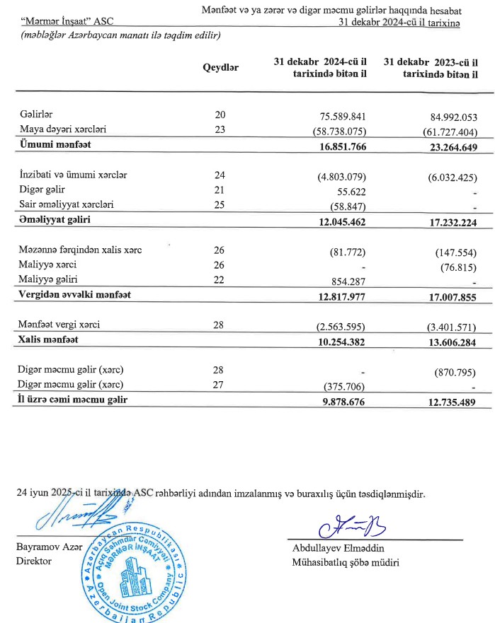 Xırdalanda yerləşən və qeyri-yaşayış binalarının tikintisi, tikinti materiallarının satışı fəaliyyətlərilə məşğul olan "Mərmər İnşaat" ASC 2024-cü ili 10 milyon 254 min manat xalis mənfəət ilə başa vurub. Şirkət 2023-cü ili 13 milyon 606 min manat xalis mənfəət ilə bağlamışdı. Beləliklə, ötən il "Mərmər İnşaat" şirkətinin xalis mənfəəti 3 milyon 352 min manat və ya 24,6% azalıb. Xalis mənfəətin azalması satış gəlirlərinin azalmasından qaynaqlanır.